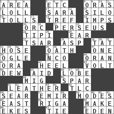 ACROSS 1. Type of rug 5. And so on (abbr.) 8. Mouths or openings 12. Hang loosely or laxly 13. "Two Mules for Sister ____" 15. Grain storage tower 16. For Whom the Bell _____ 18. Unclean, religiously 19. Naughty children 20. The grampus (Milton) 22. Son of Zeus who helped slay Medusa 24. Native american tent (variation) 26. Ewer handle 27. Russian ruler of old 28. Viper 29. Make lace 32. Flexible conduit 35. Pledge 37. Single 38. Stare at amorously 39. Non-commissioned officer (abbr.) 40. Northwest Algerian city 41. Mouth or opening 42. The bottom of a shoe or boot 43. Electrical Unit 44. Morning condensation 45. Help 46. Ear part 49. Russian fighter aircraft 50. Practice fight 51. Cordwainer's material 55. Affectionate concern, for short 56. Dry up 57. Independent ruler or chieftain 59. Methods 63. 90 degrees 64. Capital of Latvia 65. Cause to be 66. Supplements with great effort 67. Neckwear 68. Paradise DOWN 1. The first octave above the treble staff 2. Friend of Pooh 3. Pipe bend 4. One to whom something is allotted 5. Eastern Standard Time (abbr.) 6. Canvas cover 7. Algonquian 8. Flexible twig of a willow tree 9. Tall New Zealand timber tree 10. High mountains 11. Mayday 14. Anew 17. Indian titles of respect 21. Tax preparer (abbr.) 23. Plant excrement 25. Pressed 28. Ringlike coral islands and reefs 29. "Corrida" creature 30. Of or related to the anus 31. Portable shelter 32. Parka part 33. Legendary monster 34. Cole _ (cabbage dish) 36. Adept person 40. Conquer 42. Having greater elevation 45. Small island 47. Choose 48. Lip ointment 49. Shops 51. Path through which fluid escapes 52. Relaxation 53. Give off 54. Swiss mountan, "Queen of the Mountains" 56. Perceive with the eye 58. Actress Charlotte 60. Male parent 61. Make supply last 62. Elected rep.