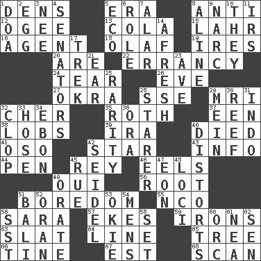 ACROSS 1. Hiding places for outlaws 5. Epoch 8. Against 12. Double curve, resembling the letter S 13. Root beer relative 15. Cowardly lion portrayer 16. Representative 18. Norwegian king 19. Angers 20. "We ___ not amused" (Victoria) 22. Tendancy to err 24. Pull into pieces 26. First lady 27. Gumbo ingredient 28. Compass dir. 29. Medical imaging device (abbr.) 32. "Mermaids" star 35. Writer of Portnoy's Complaint (1969) 37. Car or cant ending 38. Tennis shots 39. Retirement account (abbr.) 40. Passed on 41. Bear (Spanish) 42. Play the lead 43. Information 44. Animal enclosure 45. Marina Del _, California 46. Snakelike fish 49. Fr. "Yes" 50. Carrot, for example 51. Mood resulting from idleness 55. Non-commissioned officer (abbr.) 56. "Two Mules for Sister ____" 57. Supplements with great effort 59. Metal shackles 63. Narrow board 64. Actor's bit 65. Family _ (genealogy) 66. Prong on a fork 67. Eastern Standard Time (abbr.) 68. Skim DOWN 1. ___ good deed 2. Ovum 3. Born 4. Legislators 5. Environmental prefix 6. Hero or heavy, e.g. 7. Having or resembling wings 8. Place in a line 9. Drug cop 10. Those people 11. Big collection agency 14. Anew 17. Long journey 21. Hearing organ 23. "___ Maria" 25. Noteworthy scarcity 28. A viewer who gazes fixedly 29. Count _ (2 wds.) 30. Coral collection 31. _ china 32. Hoof sound 33. Stockings 34. Inky black, to poets 36. Mouth or opening 40. What propaganda does 42. A glass for beer 45. Sorrow 47. A really long time 48. Venues 49. Speak pompously 51. Indonesian resort city 52. Northwest Algerian city 53. Migrant worker of the '30s 54. Not women's 56. Fast jet (abbr.) 58. Arrange properly for use 60. The grampus (Milton) 61. Teachers' org. 62. Elected rep.