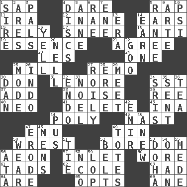 ACROSS 1. Plant excrement 4. Have the gumption 8. Hit sharply and swiftly 11. Retirement account (abbr.) 12. Silly 14. Hearing organs 15. Have trust in 17. Contemptuous expression 18. Opposed to 19. Core 21. Match 23. French article 24. Single 25. Place where flour is made 27. San ____ (Riviera town) 30. Spanish title 31. Poe poem 34. Fast jet (abbr.) 37. Increase 38. Annoying sound 39. To separate or throw off 40. Modern: prefix 41. Keyboard key 43. _ tizzy (2 wds.) 44. Much (prefix) 45. Vertical spar for supporting sails 47. Australian flightless bird 49. Shallow baking pan 50. Take or capture by force 52. Mood resulting from idleness 56. Period of immesurable duration 57. An arm off of a larger body of water 60. Had on 61. Small amounts or degrees 62. Learning spot: Fr. 63. Possessed 64. "We ___ not amused" (Victoria) 65. Chooses 66. One (Scot) DOWN 1. Title for a man of rank and authority 2. Ancient Greek god of war 3. Friends 4. Plates 5. Queen of England 1702-14 6. Actress Charlotte 7. Compass dir. 8. The wife of a rajah (variant) 9. Johnson of "Laugh-In" 10. Air pressure measure (abbr.) 13. Period 14. Merit 16. Shout 20. 1994 drama film starring Jodie Foster 22. Thick or sticky substance 25. Method 26. _ china 27. Turbulent 28. Celtic language 29. Rendezvous 30. Daniel's nick name 32. Inside; within (prefix) 33. Christmas carol 34. Indian titles of respect 35. Posted 36. Beverage made from leaves 42. Arab leader 44. Fluid product of inflammation 46. Afresh 47. Eat (away) 48. Not women's 49. Hauls 50. Erode 51. Neckwear 52. Waist strap 53. Capital of the state of Qatar 54. NW Algerian seaport 55. Ancient Persian 56. _ moment's notice (2 wds.) 58. Non-commissioned officer (abbr.) 59. Trim (branches)