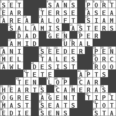 ACROSS 1. Put into a specified state 4. Without 8. Left side of a ship or aircraft 12. Hearing organ 13. Laconic 14. At sea 15. Type of rug 17. At or to great height 18. Thailand, formerly 19. Deli grouping 21. Michaelmas daisies 23. June honoree 24. Commissioned military rank (abbr.) 26. For each 27. Among 28. Mountain range 30. Black tropical American cuckoo 31. Sowing specialist 34. Animal enclosure 37. Cartoonist voice _ Blanc 38. Stories 39. The grampus (Milton) 40. Leather borer 41. Cease 42. Friend of Pooh 43. Wig 44. Flats, for short 46. Nine, plus one 47. Trim (branches) 50. Automobile 51. Centers of feelings and intuitions 54. Devices for capturing images 57. Legendary monster 58. Representative 60. Native american tent (variation) 62. Vertical spar for supporting sails 63. Theater features 64. Small child 65. Singer Brickell 66. Elected reps. 67. R.R. building DOWN 1. Ocean 2. Hearing organs 3. Excercise machine 4. Former Milwaukee Brewers owner Bud 5. Came up 6. Overdraft (abbr.) 7. Stalk of a moss capsule 8. Soft color 9. Flexible twig of a willow tree 10. Hitchcock's "____ Window" 11. Scottish caps 13. Scottish cap 16. Jai _ 20. Say or write further 22. Practice fight 25. Unclothed pictures 27. Afresh 29. Remainder 30. Housemaid (var.) 31. Proofreading order 32. Artist's stand 33. Connecticut Ivy Leaguer 34. Likenesses of persons 35. Greek god of love 36. Non-commissioned officer (abbr.) 41. Undesirable depression on a surface 43. Cylindrical with tapered ends 44. Adept person 45. Component 46. Tarsus (plural) 48. Sea 49. Leg coverings 51. Dwelling 52. Mild oath 53. Backtalk 55. Mountains (abbr.) 56. Blemish 59. Unit of force equal to gravity 61. Call ___ day