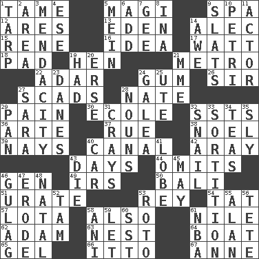 ACROSS 1. Docile 5. Wise men 9. Health resort 12. Ancient Greek god of war 13. Paradise 14. Actor Baldwin 15. French philosopher Descartes 16. The main thing one is thinking about 17. Electrical Unit 18. Writing tablet 19. Layer 21. Paris' subway 22. The sixth month of the Jewish calendar 24. Chewing product 26. Title for a knight 27. Large numbers or amounts 28. Nathan's nickname 29. Ache 30. Learning spot: Fr. 32. Fast planes 36. Johnson of "Laugh-In" 37. Regret 38. Christmas carol 39. Negative votes 40. Lessep's creation 42. Like ___ of sunshine 43. 24-hour periods 44. Leaves out 46. Commissioned military rank (abbr.) 49. Big collection agency 50. Indonesian resort city 51. A salt of uric acid 53. Marina Del _, California 54. Make lace 57. Globular water bottle used in Asia 58. In addition 61. The longest river in the world 62. First of billions? 63. Egg locale 64. Water vessel 65. Set 66. "Tell ____ the Marines!" 67. Singer Murray DOWN 1. Canvas cover 2. Length times width 3. Ananias' fault 4. Compass dir. 5. Chow _ 6. Find the sum of 7. Unit of force equal to gravity 8. _ tizzy (2 wds.) 9. Narrow boards 10. _ dish (used to culture cells) 11. Thespian 14. Deep reverence 19. Possessed 20. Celtic language 21. Madame (abbr.) 23. Natives or inhabitants of Denmark 24. An organ shaped like a helmet 25. Shoshoni 27. "Two Mules for Sister ____" 28. Parts of speech 29. Baking dish 31. Trading vessels 32. Slow-paced one 33. Making a chance decision by using lots 34. Beverages made from leaves 35. Insidious 40. 4-wheeled motor vehicle 41. Ear part 43. Pass on 45. Fifth month 46. POW camp 47. Eat (away) 48. Relating to or accompanying birth 52. Scottish cap 53. Printing process, for short 55. ____ Jay Lerner 56. False hair 58. Black tropical American cuckoo 59. Allow 60. Fast jet (abbr.) 61. Basketball assoc.