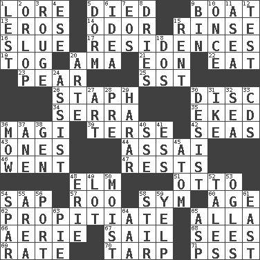 ACROSS 1. Old wives' tales, e.g. 5. Passed on 9. Water vessel 13. Greek god of love 14. Aroma 15. Wash lightly 16. Change direction abruptly 17. Dwellings 19. Coat; cloak 20. Wet nurse (var.) 21. Period of immesurable duration 22. Erode 23. Lightbulb-shaped fruit 25. Fast jet (abbr.) 26. Staphylococcus 30. Flat circle 34. Father Junipero _ 35. Supplemented with great effort 36. Wise men 39. Laconic 42. Oceans 43. Washington bills 44. Slender Brazilian palm 46. Left 47. Musical pauses 48. Shade tree 51. "Beetle Bailey" pooch 54. Plant excrement 57. Friend of Pooh 58. Symbol (abbr.) 60. Ripen 62. Conciliate 65. Silent film actress Nazimova 66. Nest on high 67. Travel by water 68. Observes 69. Assign a rank or rating to 70. Canvas cover 71. Inconspicuous attention getter DOWN 1. For fear that 2. Lowest deck of a ship 3. Makeup applied to the cheeks 4. Compass dir. 5. Dormintory (informal) 6. It may be bright or harebrained 7. Greek goddess of the dawn 8. Frees from moisture 9. Storage container 10. At one time in the past 11. At sea 12. Trial 15. Monthly bill 18. Two (Sp.) 20. Johnson of "Laugh-In" 24. Help 27. Tate display 28. Before (prefix) 29. Ethiopian city, capital of Harari 30. Cease 31. Mamie's mate 32. Ocean 33. Music discs 36. Cut the grass 37. A saturated hydrocarbon 38. Commissioned mil. rank 40. Compass dir. 41. Curvy letter 45. Tiny particle 48. One of the Great Lakes 49. Car dealer's back yard 50. Wet 52. Falsehoods 53. Stares 54. Practice fight 55. Type of rug 56. Left side of a ship or aircraft 58. Commotion 59. Sharp bark 61. 90 degrees 63. Sliced dessert 64. Auto club (abbr.) 65. Viper