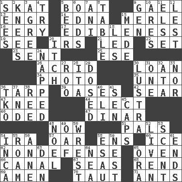 ACROSS 1. Three-handed card game 5. Water vessel 9. Highlander 13. Engineer (abbr.) 14. Pulitzer Prize-winning author Ferber 15. Haggard of country music 16. Suggestive of the supernatural 17. The property of being fit to eat 19. Perceive with the eye 20. Big collection agency 21. Directed 22. Arrange properly for use 23. Transmitted 25. Compass dir. 26. Bitter 30. Grant temporary use of 34. Picture 35. To (old English) 36. Canvas cover 39. Fertile tracts in a desert 42. Burn superficially 43. Leg joint 44. Opt 46. Wrote a lyric poem 47. Middle Eastern gold or silver currency 48. Immediately 51. Friends 54. Lyricist Gershwin 57. Rowing implement 58. Followers of ems 60. Frozen water 62. Unrelated to defense, as in spending 65. Baking chamber 66. Lessep's creation 67. Oceans 68. Tear apart 69. So be it 70. Pulled tight 71. Pismires DOWN 1. Perceives with the eye 2. Leg joints 3. Match 4. Attempt 5. Fermented drink made from hops 6. Probability 7. Cuckoo 8. Eating place 9. Commissioned military rank (abbr.) 10. Ancient Greek god of war 11. Otherwise 12. For fear that 15. Ancient Persian 18. French article 20. Hankering 24. Slept 27. Friend of Pooh 28. Call ___ day 29. Administered medicine 30. A period of five years 31. Single 32. "One Day ___ Time" 33. Not either 36. Ring climax 37. Plus 38. To riddle 40. Connecticut Ivy Leaguer 41. Elected rep. 45. Smile enhancers 48. Christmas carol 49. Clumsy lout 50. Take or capture by force 52. Make or become more lively 53. Aroma 54. South American Indian 55. Wander 56. Singer Murray 58. He sold his birthright 59. A home for chicks 61. Conclusions 63. Daniel's nick name 64. Teachers' org. 65. Mouth or opening