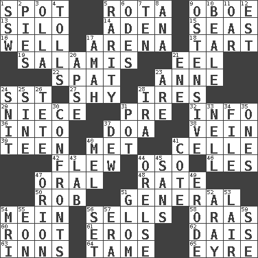 ACROSS 1. Blemish 5. Round or rotation of duties 9. Mitch Miller's instrument 13. Grain storage tower 14. An important port of Yemen 15. Oceans 16. Water source 17. Sports stadium 18. Small pie 19. Deli grouping 21. Snakelike fish 22. Petty quarrel 23. Queen of England 1702-14 24. Fast jet (abbr.) 27. Like a shrinking violet 28. Angers 29. Sibling's daughter 31. Before (prefix) 32. A message received and understood 36. To the inside or interior of 37. ___ good deed 38. Distinctive style or manner 39. Adolescent 40. Was introduced to 41. Cell (Danish) 42. Soared 44. Bear (Spanish) 46. French article 47. Spoken 48. Assign a rank or rating to 50. Director Reiner 51. Commissioned military rank 54. Chow _ 56. Exchanges for money 58. Mouths or openings 60. Carrot, for example 61. Greek god of love 62. Raised platform 63. Taverns 64. Not wild 65. Jane of fiction DOWN 1. Compass dir. 2. Sliced desserts 3. Spanish pot 4. For Whom the Bell _____ 5. Noteworthy scarcity 6. Lyric poems 7. "___ Little Indians" 8. Santa ___, CA 9. Clearly or manifestly demonstrative 10. Calif. Air Force Base 11. Rowing implement 12. Eastern Standard Time (abbr.) 17. Wet nurse 20. Domed church section 21. Compass dir. 23. "We ___ not amused" (Victoria) 24. In a ____ (agitated or irritated) 25. Trig term 26. False hair 28. Retirement account (abbr.) 30. Meets 31. Plant holder 33. 1994 drama film starring Jodie Foster 34. Do some clerical work 35. Singles 37. Morning condensation 40. Cartoonist voice _ Blanc 41. ____ d'Azur (French Riviera) 43. Experiment locale 44. Threatening words 45. Without 47. Constellation of myth 49. Wear away 51. Take by theft 52. Like ___ of sunshine 53. Den 54. Medical imaging device (abbr.) 55. Period of immesurable duration 56. Put into a specified state 57. Epoch 59. Compass dir.
