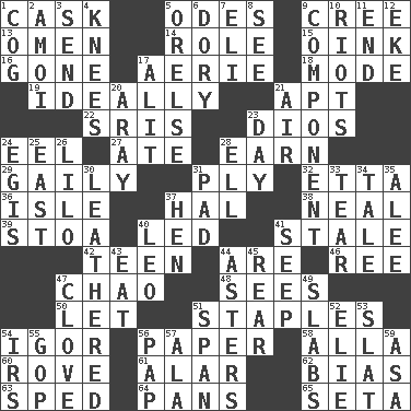 ACROSS 1. Keg 5. Lyric poems 9. Algonquian 13. Sign of things to come 14. Hero or heavy, e.g. 15. Pig sound 16. Went 17. Nest on high 18. Method 19. Under perfect conditions 21. Fitting 22. Indian titles of respect 23. "Vaya con ____" 24. Snakelike fish 27. Had dinner 28. Merit 29. Lightheartedly 31. Strand of rope, yarn or thread 32. Singer James 36. Capri or Wight 37. Actor Linden 38. Anneal 39. Portico 40. Directed 41. Having lost freshness 42. Adolescent 44. "We ___ not amused" (Victoria) 46. To separate or throw off 47. US Secretary of Labor Elaine L. _ 48. Perceives with the eye 50. Allow 51. Paper fasteners 54. Composer Stravinsky 56. Some stationery 58. Silent film actress Nazimova 60. Be footloose 61. Having or resembling wings 62. Prejudice 63. Drove too fast 64. Baking dishes 65. Bristle DOWN 1. Gear tooth 2. Mine, in Marseilles 3. Post 4. Leg joints 5. Threatening words 6. Rowboat 7. Biblical high priest 8. Observe 9. Part 10. Disturbances 11. Conclusion 12. Supplement with great effort 17. Set down 20. Like ___ of sunshine 21. Atmosphere 23. 24 hours 24. Armor plate that protects the chest 25. Compass direction 26. _ and Stitch 28. Pipe bend 30. Resembling or made to resemble leather 31. Writing tablet 33. Rend 34. Falsehood 35. Toward shelter 37. Layer 40. Lion 41. Ooze 43. Ingest 44. Michaelmas daisies 45. Stern 47. Garlic unit 49. Thick slices 51. Connect, as a bridge 52. Writer Wiesel 53. Narrow board 54. Big collection agency 55. Republican Party 56. Infant food 57. In the manner of 59. White ___ sheet