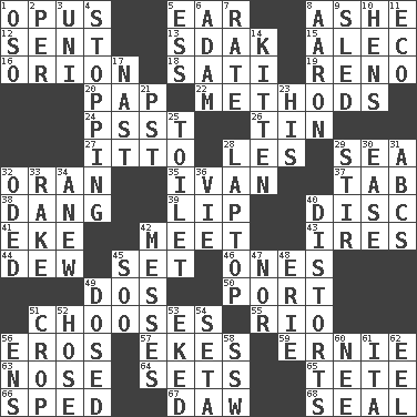 ACROSS 1. Musical composition 5. Hearing organ 8. American tennis player Robert 12. Transmitted 13. Neighbor of Neb. 15. Actor Baldwin 16. Greek mythologigal hunter 18. Suttee (variant) 19. Former U.S. Attorney General Janet 20. Infant food 22. Modes 24. Inconspicuous attention getter 26. Metal container 27. "Tell ____ the Marines!" 28. French article 29. Ocean 32. Northwest Algerian city 35. _ the terrible 37. Bar bill 38. Mild oath, euphamism for damn 39. Mouth edge 40. Compact _ 41. Make supply last 42. Rendezvous 43. Angers 44. Morning condensation 45. Put into a specified state 46. Singles 49. Two (Sp.) 50. Left side of a ship or aircraft 51. Elects 55. _ de Janeiro 56. Greek god of love 57. Supplements with great effort 59. Bert's buddy 63. Characteristic smell of wine 64. Puts into a specified state 65. Wig 66. Drove too fast 67. Simpleton 68. Lick closed DOWN 1. Bear (Spanish) 2. For each 3. Corn or form start 4. Ceasing 5. Double-curved letter 6. First man 7. Assign a rank or rating to 8. Composer Copland 9. Downhill vehicle 10. Coop moms 11. Environmental prefix 14. Baby cat 17. Political cartoonist Thomas 21. Pacific Standard Time (abbr.) 23. Part of HMS, perhaps 25. Bathroom 28. Portable computer 29. Use a spoon 30. Comfort 31. Lettered men learn these first 32. Wrote a lyric poem 33. Libertine 34. Afresh 36. Compete 40. What propaganda does 42. Makes clutter 45. "Barney Miller" actor Jack 47. Not either 48. One of the Great Lakes 49. Administered medicine 51. Riding implement 52. Flexible conduit 53. Made supply last 54. Bristle 56. Followers of ems 58. Compass dir. 60. Born 61. Call ___ day 62. Snakelike fish