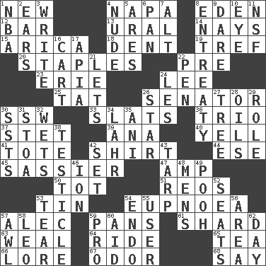 ACROSS 1. ___ Haven, CT 4. California wine valley 8. Genesis locale 12. Oblong piece of solid material 13. Mountain range 14. Negative votes 15. N. Chile seaport 18. Gouge 19. Not kosher 20. Paper fasteners 22. Before (prefix) 23. 4th largest of the Great Lakes 24. Area sheltered from the wind 25. Make lace 26. Elected representative 30. Compass dir. 33. Narrow boards 36. Musical group of three 37. Proofreading order 39. Santa ___, CA 40. Shout 41. Carryall 42. Upper-body garment 44. Compass dir. 45. More disrespectful 47. Electrical Unit 50. Small child 51. Vintage cars 53. Metal container 54. Normal relaxed breathing 57. Actor Baldwin 59. Zero-star reviews 61. Broken piece 63. Welt 64. Travel on an animal 65. Afternoon social gathering 66. Old wives' tales, e.g. 67. Aroma 68. Declare DOWN 1. Basketball assoc. 2. Hearing organs 3. Compose 4. Naked 5. Ancient Greek god of war 6. Baking dish 7. Keyboard modifier key 8. Plea 9. Have the gumption 10. Sight organ 11. Science/research agcy. 16. Draw slowly or heavily 17. Capital of Western Samoa 21. Allows 22. Writing instrument 24. French article 26. Play the lead 27. Relationship diagram 28. Lubricates 29. Hero or heavy, e.g. 30. Fast planes 31. Portico 32. Moistens 34. Cowardly lion portrayer 35. Cuckoo 38. One of the two male reproductive glands 42. Arrange properly for use 43. Canvas cover 46. Electrically charged atom 48. Not women's 49. "Silly old bear" 52. Theater features 53. Separate forcefully 54. Inside; within (prefix) 55. One who makes use of a thing 56. Length times width 57. Leather borer 58. Lion 59. Adept person 60. Assist 62. 24 hours