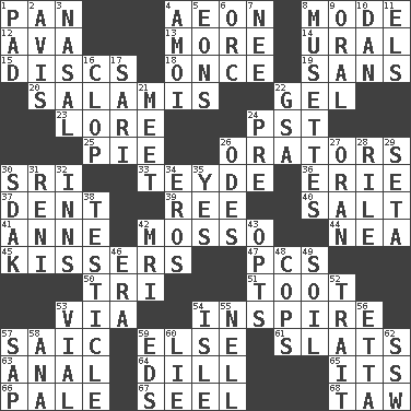 ACROSS 1. Baking dish 4. Period of immesurable duration 8. Method 12. Actress Gardner 13. Greater amount 14. Mountain range 15. Flat circles 18. Single time 19. Without 20. Deli grouping 22. Set 23. Old wives' tales, e.g. 24. Pacific Standard Time (abbr.) 25. Sliced dessert 26. Speakers 30. Indian title of respect (Mr.) 33. Miss Universe 1986, Barbara Palacios _ 36. 4th largest of the Great Lakes 37. Undesirable depression on a surface 39. To riddle 40. Table seasoning 41. Singer Murray 42. With motion or animation 44. Teachers' org. 45. Smoochers 47. Personal Computers (abbr.) 50. Three (prefix) 51. A blast of a horn 53. By way of 54. Stimulate to action 57. Ketch in the Levant 59. Otherwise 61. Narrow boards 63. Of or related to the anus 64. Deli pickle 65. It is 66. Diluted with white 67. Stitch closed the eyes of (a falcon) 68. The 23rd letter of the Hebrew alphabet DOWN 1. Groovy apt. 2. Deliberation 3. Rhinal 4. Mine, in Marseilles 5. Immeasurably long periods of time 6. The grampus (Milton) 7. Born 8. French bagpipes 9. Relating to the mouth 10. Daniel's nick name 11. Raised railways 16. Hoof sound 17. Indian skirt 21. Rendezvous 22. Girls' org. (abbr.) 24. Before (prefix) 26. Lyric poems 27. NW Algerian seaport 28. Cause heat under the collar 29. Stalk of a moss capsule 30. Neighbor of Neb. 31. Painter Guido (1575-1642) 32. Lodging establishments 34. Greek god of love 35. Consenting reply 38. A testis 42. Medical imaging device (abbr.) 43. Chooses 46. Epoch 48. 911 reaches them 49. Land 52. Distinguishing feature 53. Small bottle 54. Small island 55. 1994 drama film starring Jodie Foster 56. Singer James 57. Plant excrement 58. Santa ___, CA 59. Begley and Asner 60. Whopper 62. Compass dir.
