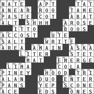ACROSS 1. Nathan's nickname 5. Fitting 8. Make lace 11. Approach 13. Friend of Pooh 14. Docile 15. Thick mixture 16. Small bed 17. Blind as ____ 18. Keyboard modifier key 19. Quiet! 21. Came up 22. "Tell ____ the Marines!" 24. Expressions of contempt or scorn 25. Buttonhole 27. Shoshoni 29. Table seasoning 30. Compose 32. Length times width 33. With great haste 35. "____ silly question..." 39. 61 cubic inches 41. Proofreading order 42. Floor protector 43. Develop 45. Pale green bean 48. Root beer relative 49. Abounding in pines 50. Parka part 52. Three (prefix) 55. ____ Jay Lerner 56. Superhero pair 57. Keyboard key 59. Zero-star reviews 60. Slangy assent 61. Biscuitlike quick bread 62. Adept person 63. Begley and Asner 64. Washington bills DOWN 1. California wine valley 2. Of or related to the anus 3. A testis 4. Erode 5. Bowlike part 6. "Silly old bear" 7. Small child 8. Off limits 9. Collect or gather 10. False hair 12. Musical pauses 14. Pacific island yam 20. Being at a high temperature 21. Collude with 23. Add up to 25. White ___ sheet 26. Auto 27. RI univ. 28. Metal container 30. Armed conflict 31. Artist's stand 33. _ moment's notice (2 wds.) 34. Was introduced to 36. Ski resort town in Vermont 37. Cask 38. Had dinner 40. "If ____ say so..." 43. Environmental prefix 44. Methods 45. Pale purple color 46. Empty; void 47. Not women's 49. Dad 50. Took on color 51. I made a mistake 53. French philosopher Descartes 54. Angers 56. Color 58. Non-commissioned officer (abbr.)