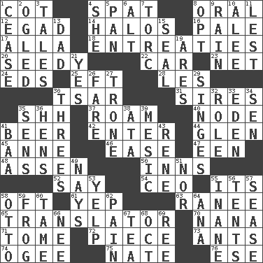 ACROSS 1. Small bed 4. Petty quarrel 8. Taken by mouth 12. Mild oath 14. Rings 16. Light colored 17. Silent film actress Nazimova 18. Pleas 20. Sleazy 22. Automobile 23. Fish or hair follower 24. Begley and Asner 25. Newt 28. French article 30. Russian ruler of old 31. Founders of families 35. Quiet! 37. Wander aimlessly 40. Thickened enlargement 41. Fermented drink made from hops 42. Keyboard key 44. Small, secluded valley 45. Singer Murray 46. Relaxation 47. Car or cant ending 48. NE Netherlands city 50. Lodging establishments 52. Declare 54. Corporate head (abbr.) 55. ___ a Wonderful Life 58. Often (poetically) 61. Slangy assent 63. The wife of a rajah (variant) 65. Interpreter 70. Nanny 71. Heavy book 72. Component 73. Pismires 74. Double curve, resembling the letter S 75. Nathan's nickname 76. Compass dir. DOWN 1. Desist 2. Stared at amorously 3. Stories 4. A female animal or person 5. Baking dish 6. Keyboard modifier key 7. Torque (variant) 8. Choose 9. Precipitation 10. Toward shelter 11. For fear that 13. June honoree 15. Lick closed 19. Ancient Greek god of war 21. Affirmative reply 26. Conductor's collection 27. Heavy duty weighing machine 29. Scorches 30. Triads 32. Hero or heavy, e.g. 33. Locale of original sin 34. Elected rep. 35. Elected reps. 36. Coop moms 38. "One Day ___ Time" 39. Of or pertaining to a meson 41. Sound made by sheep 43. French philosopher Descartes 49. Negative votes 51. Not either 53. Sharp bark 55. Lacking in sense or substance 56. Portable shelters 57. Gospel singer Marvin 58. Von Bismarck 59. Toadlike animal 60. Docile 62. Ache 64. Santa ___, CA 66. Born 67. Beverage made from leaves 68. Sep. follower 69. To separate or throw off