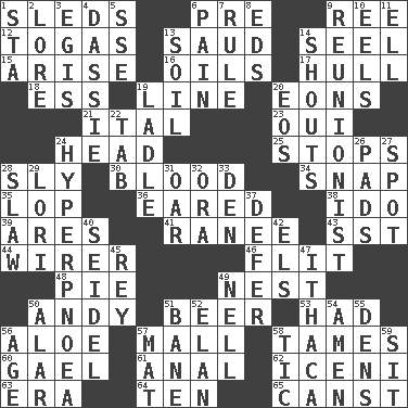 ACROSS 1. Bobsleighs 6. Before (prefix) 9. To separate or throw off 12. Ancient Roman robes 13. Saudi Arabian king (1953-1964) 14. Stitch closed the eyes of (a falcon) 15. Originate 16. Petroleums 17. Frame or body of a ship 18. Double-curved letter 19. Actor's bit 20. Immeasurably long periods of time 21. Slanted text style (abbr.) 23. Fr. "Yes" 24. Froth on beer 25. Closes up, plugs up 28. Wily 30. Vital fluid 34. Fastener 35. Chop off 36. Having ears or earlike features 38. Wedding promise 39. Ancient Greek god of war 41. Indian princess (variant) 43. Fast jet (abbr.) 44. One who wires 46. Sudden quick movement 48. Sliced dessert 49. Egg locale 50. Actor Griffith 51. Fermented drink made from hops 53. Possessed 56. Medicinal plant 57. Promenade 58. Domesticates 60. Highlander 61. Of or related to the anus 62. Ancient Celtic tribe of eastern Britain 63. Epoch 64. Nine, plus one 65. 2nd pers. sing. pres. of can (arch.) DOWN 1. R.R. building 2. Old wives' tales, e.g. 3. Armor plate that protects the chest 4. Hyrax 5. Compass dir. 6. Ache 7. Court order 8. Begley and Asner 9. One who advocates reunion 10. Snakelike fish 11. Pipe bend 13. Earth 14. Yells 19. Dipping utensil 20. Greek goddess of the dawn 22. Bar bill 24. Abnormally rapid or deep breathing 26. Groovy apts. 27. Specific locale 28. Cole _ (cabbage dish) 29. Australian parrot (variant) 31. Rowing implement 32. Mouth or opening 33. Lair 37. Put off 40. A glass for beer 42. Raised railways 45. Marina Del _, California 47. New York city 49. 1994 drama film starring Jodie Foster 50. Having or resembling wings 51. Object of repulsion 52. Flair 54. So be it 55. Hiding places for outlaws 56. Mature 57. Floor covering 58. Nervous spasm 59. Be seated