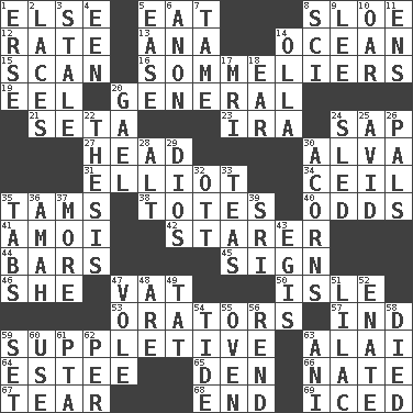 ACROSS 1. Otherwise 5. Consume 8. A type of plum 12. Pace 13. Santa ___, CA 14. Sea 15. Glance over 16. Wine waiters 19. Snakelike fish 20. Commissioned military rank 21. Stalk of a moss capsule 23. Retirement account (abbr.) 24. Plant excrement 27. Froth on beer 30. Inventor's middle name 31. American author Paul (1891-1958) 34. To provide with a ceiling 35. Scottish caps 38. Hauls 40. Probability 41. Mine, in Marseilles 42. A viewer who gazes fixedly 44. Oblong pieces of solid material 45. Signal 46. A female animal or person 47. Large container 50. Small island 53. Speakers 57. Indiana (abbr.) 59. Supplementary 63. Jai _ 64. First name in cosmetics 65. Lair 66. Nathan's nickname 67. Rend 68. Conclusion 69. On the rocks DOWN 1. Celtic language 2. Shoestrings 3. Having lost freshness 4. Car or cant ending 5. Comfort 6. At once, immediately (arch.) 7. Docile 8. _-fi 9. Area sheltered from the wind 10. Rowing implement 11. Followers of ems 14. Water jar 17. Medical imaging device (abbr.) 18. Ewer handle 20. Highlander 22. College paper 24. Downhill vehicle 25. Enthusiastic 26. Friends 28. Keyboard modifier key 29. "Vaya con ____" 30. Oak nuts 32. Baseball player Mel 33. Afternoon social gatherings 35. Bar bills 36. Housemaid 37. Greater amount 39. Indian title of respect (Mr.) 43. The front part of a cuirass 47. Short-tailed, large-bodied rat 48. "We ___ not amused" (Victoria) 49. Make lace 51. Pale purple color 52. Related on the mother's side 54. Event that recurs at intervals 55. Baking chamber 56. Tear apart 58. Passed on 59. Arrange properly for use 60. Purpose 61. Parent Teacher Association (abbr.) 62. For each 63. Black tropical American cuckoo