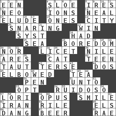 ACROSS 1. Car or cant ending 4. _ gin 8. Angers 12. Modern: prefix 13. Charged atoms 14. Actress Patricia 15. Evade 18. Washington bills 19. Municipality 20. Catching in a trap 22. Victory 23. System (abbr.) 24. Possessed 25. Ocean 26. Mood resulting from idleness 30. Not either 33. It is permitted: Lat. 36. The longest river in the world 37. Ancient Greek god of war 39. Domesticated feline 40. Adolescent 41. Tense 42. Laconic 44. Two (Sp.) 45. Turned at an angle; bent 47. Beverage made from leaves 50. Animal enclosure 51. To (old English) 53. Elect 54. Noisy, rowdy, vocal (Spanish) 57. Australian parrot (variant) 59. Musical composition 61. Grin 63. SW Asia republic 64. Cause heat under the collar 65. Raised railways 66. Mild oath, euphamism for damn 67. Fermented drink made from hops 68. Actress Charlotte DOWN 1. Compass dir. 2. Snakelike fish 3. Parts of speech 4. The Jewish people; Israel 5. Protracted 6. Single 7. Double-curved letter 8. Happening 9. It's straight from the horse's mouth 10. Erode 11. Cunning 16. 24-hour periods 17. Celtic language 21. Slanted text style (abbr.) 22. Armed conflict 24. Being at a high temperature 26. Wagers 27. Passed on 28. Butter sub 29. Not women's 30. Nathan's nickname 31. Relating to the mouth 32. Reuben's nickname 34. On the rocks 35. 4-wheeled motor vehicle 38. Ceasing 42. Nine, plus one 43. Needle holder 46. Soggy 48. Extremities 49. Tiny particle 52. Flexible twig of a willow tree 53. NW Algerian seaport 54. General guideline 55. One who uses or employs something 56. Rounded earthenware pot or jar 57. Hat (slang) 58. Mouth or opening 59. Globe 60. Sliced dessert 62. Compass dir.