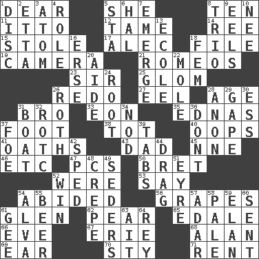 ACROSS 1. Letter starter 5. A female animal or person 8. Nine, plus one 11. "Tell ____ the Marines!" 12. Docile 14. To sift 15. Fur scarf 17. Actor Baldwin 18. Do some clerical work 19. Device for capturing images 21. Lover boys 23. Title for a knight 25. Take by theft 26. Make new 27. Snakelike fish 28. Personal question 31. Sis' sibling 33. Period of immesurable duration 35. Ferber et al. 37. Pick up the tab 38. Small child 40. I made a mistake 41. Curses 43. Male parent 45. Compass dir. 46. And so on (abbr.) 47. Personal Computers (abbr.) 50. Cy Young winner Saberhagen 52. Past tense of be (plural) 53. Declare 54. Tolerated 56. Raisin fruits 61. Small, secluded valley 62. Lightbulb-shaped fruit 65. Peak District village in England 66. First lady 67. 4th largest of the Great Lakes 68. ____ Jay Lerner 69. Ewer handle 70. Filthy place 71. Monthly bill DOWN 1. Plate 2. Singer James 3. Smallest unit of an element 4. Hero or heavy, e.g. 5. R.R. building 6. Actor Linden 7. Develop 8. Musical group of three 9. Snakelike fish 10. Born 13. Learning spot: Fr. 16. Celtic language 18. Opposite of masc. 20. Assistant 22. Undercover agent 24. Carrot, for example 26. Writer of Portnoy's Complaint (1969) 28. Soon (poet.) 29. Stare wonderingly 30. Double-curved letter 31. Water vessel 32. College mil. group 34. Dreamland 36. Do not 37. Enemy 39. Bar bills 42. Hurried 44. To trail on the ground 48. Streamer paper 49. Spring feasts 51. Jane of fiction 52. Acquire through effort 54. Inventor's middle name 55. Fermented drink made from hops 57. The sixth month of the Jewish calendar 58. Diluted with white 59. Liveliness 60. Posted 61. Turn to the right 63. Small island 64. Marina Del _, California