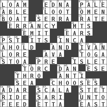 ACROSS 1. Rich soil 5. Pulitzer Prize-winning author Ferber 9. Diluted with white 13. Competent 14. Plunder 15. Sign of something about to happen 16. Water vessel 17. Father Junipero _ 18. Pace 19. The state or an instance of erring 21. Mountains (abbr.) 22. Give off 23. Hearing organs 24. Pacific Standard Time (abbr.) 27. ___ a Wonderful Life 28. South American Indian 29. Hold, grip (Informal) 31. Also 32. _ the terrible 36. Old wives' tales, e.g. 37. Actress Gardner 38. Ancient Roman robe 39. Portico 40. Before (prefix) 41. Small island 42. Torque (variant) 44. One of the 12 tribes of Israel 46. Compass dir. 47. Through, poetically 48. Opposed to 50. Ocean 51. Opts 54. The sixth month of the Jewish calendar 56. Any of the three canals of the cochlea 58. Proofreading order 60. Travel on an animal 61. Indian skirt 62. To (old English) 63. Nourish 64. Singer James 65. Compass direction DOWN 1. Experiment locale 2. Mitch Miller's instrument 3. Having or resembling wings 4. Distance measurement (Brit.) 5. Chooses 6. Rowboat 7. And not 8. _ moment's notice (2 wds.) 9. Likenesses of persons 10. Collect or gather 11. Allow 12. Compass dir. 17. In a ____ (agitated or irritated) 20. Among 21. Apple computer (short form) 23. Conclude 24. Friends 25. Attempt 26. "Corrida" creature 28. _ tizzy (2 wds.) 30. Tough but pliablecoriaceous 31. "___ Maria" 33. Grand slam 34. Ripens 35. Nathan's nickname 37. Curve 40. Adept person 41. To the inside or interior of 43. Mouth or opening 44. Mexican or Central American flower 45. Small Philippine buffalo 47. Sadhe (variant) 49. Come out of 51. Heavy open wagon 52. Inactive volcano in Sicily 53. Puts into a specified state 54. Sandy's bark 55. Expire 56. Compass dir. 57. Feline 59. Small child