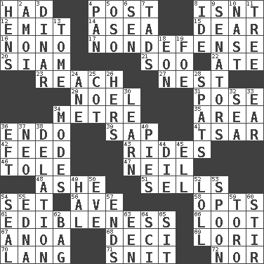 ACROSS 1. Possessed 4. Mail 8. Is not 12. Send forth 14. Toward the sea 15. Letter starter 16. Words to Nanette 17. Unrelated to defense, as in spending 20. Thailand, formerly 21. "Barney Miller" actor Jack 22. Had dinner 23. Arrive at 27. A home for chicks 29. Christmas carol 31. Airs 34. Distance measurement (Brit.) 35. Length times width 36. Inside; within (prefix) 39. Plant excrement 41. Russian ruler of old 42. Nourish 43. Amusement-park features 46. Lacquered or enameled metalware 47. Famous astronaut Armstrong 48. American tennis player Robert 51. Makes a sale 54. Put into a specified state 56. "___ Maria" 58. Elects 61. The property of being fit to eat 66. Spoils 67. Small Philippine buffalo 68. Tenth: prefix 69. Australian parrot (variant) 70. Long (Scottish) 71. In a ____ (agitated or irritated) 72. And not DOWN 1. Coop moms 2. Mine, in Marseilles 3. Middle Eastern gold or silver currency 4. Baking dish 5. Bear (Spanish) 6. Elected rep. 7. Bits 8. Binary compound 9. Legislators 10. Political cartoonist Thomas 11. Family _ (genealogy) 13. Heavy book 18. A really long time 19. Enemy 24. One (Scot) 25. Small bed 26. Possessive pronoun 28. Arguments over trivial matters 30. Memorize 32. Ocean 33. Ewer handle 34. Methods 36. Lizard (obsolete) 37. Modern: prefix 38. Conveyance 40. Sliced desserts 44. Expire 45. Pipe bend 49. Actor Linden 50. Night before a holiday 52. Hang loosely or laxly 53. Soup utensil 54. Lick closed 55. Pulitzer Prize-winning author Ferber 57. Conclusions 59. "Corrida" creature 60. Tumult 62. Paper or plastic container 63. Car or cant ending 64. _-fi 65. Be seated