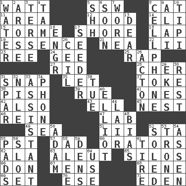 ACROSS 1. Electrical Unit 5. Compass dir. 8. Domesticated feline 11. Length times width 12. Parka part 14. Biblical high priest 15. Singer Mel 17. Dinah or Pauly 18. Pet locale 19. Core 21. Teachers' org. 22. Cards in a Roman deck? 23. To riddle 24. Unit of force equal to gravity 25. Reproach for some lapse or misdeed 27. To free from 28. "Mermaids" star 31. Fastener 35. Allow 37. Casino tip 38. Expression of disdain 39. Sorrow 41. Washington bills 42. In addition 43. Pipe bend 45. Egg locale 46. It's straight from the horse's mouth 47. Experiment locale 49. Ocean 51. One more than two 52. R.R. building 55. Pacific Standard Time (abbr.) 57. Male parent 60. Speakers 62. In the manner of 63. Native American of Southwest Alaska 65. Grain storage towers 66. Spanish title 67. Not women's 68. French philosopher Descartes 69. Put into a specified state 70. Compass dir. 71. Locale of original sin DOWN 1. Wetness 2. Came up 3. Laconic 4. Not wild 5. Quiet! 6. Within a short period 7. Had on 8. Portable communications device 9. Jai ____ 10. Native american tent (variation) 13. Letter starter 16. Engineer (abbr.) 17. Sowing specialist 20. To provide with a ceiling 26. NE Massachussets city 29. Makes supply last 30. Take ten 31. Coast Guard woman 32. Mediterranean tributary 33. Helper 34. Give a jingle 36. Third day of the wk. 40. American author Paul (1891-1958) 44. Den 48. Prejudice 50. First of billions? 52. Having a sole or soles 53. Marketplace scale 54. NE Netherlands city 55. Groovy apts. 56. A type of plum 58. Toward shelter 59. Hiding places for outlaws 61. Hoop that covers a wheel 64. Purpose