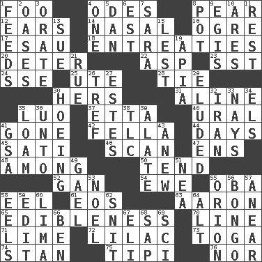 ACROSS 1. Egg _ yung 4. Lyric poems 8. Lightbulb-shaped fruit 12. Hearing organs 14. Rhinal 16. Legendary monster 17. He sold his birthright 18. Pleas 20. Prevent from occurring 22. Viper 23. Fast jet (abbr.) 24. Compass dir. 25. Shoshoni 28. Neckwear 30. Possessive pronoun 31. Place in a line 35. Nilotic language 37. Singer James 40. Mountain range 41. Went 42. Man or boy (slang) 44. 24-hour periods 45. Suttee (variant) 46. Examine minutely or intensely 47. Followers of ems 48. Amid 50. Look after 52. Separate the seeds from cotton 54. She-sheep 55. Chief or king in Benin or Nigeria 58. Snakelike fish 61. Greek goddess of the dawn 63. Composer Copland 65. The property of being fit to eat 70. Actor's bit 71. Citrus frut 72. Pale purple color 73. Ancient Roman robe 74. Comedian Laurel of Laurel & Hardy 75. Native american tent (variation) 76. And not DOWN 1. Gives food to 2. Fertile tracts in a desert 3. Speak pompously 4. Single 5. One of the 12 tribes of Israel 6. Eastern Standard Time (abbr.) 7. "Two Mules for Sister ____" 8. Cooking vessel 9. Armor plate that protects the chest 10. Ancient Greek god of war 11. Relief 13. Take to court 15. For fear that 19. Capital of Western Samoa 21. Sorrow 26. Not kosher 27. _____ Park, CO 29. Evaded 30. Cultivating 32. SW Asia republic 33. Negative votes 34. Raised railways 35. Rich soil 36. To (old English) 38. Affectionate concern, for short 39. Having winglike extensions 41. Girls' org. (abbr.) 43. Afresh 49. Highlander 51. Teachers' org. 53. Christmas carol 55. Constellation of myth 56. Beat drum 57. Approach 58. Snakelike fish 59. Prepare for publication 60. Pale green bean 62. In a ____ (agitated or irritated) 64. Keyboard modifier key 66. Benjamin's nick name 67. Connecticut Ivy Leaguer 68. Plant excrement 69. _-fi