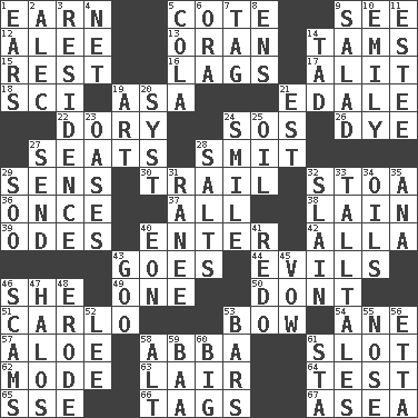 ACROSS 1. Merit 5. ____ d'Azur (French Riviera) 9. Observe 12. Toward shelter 13. NW Algerian seaport 14. Scottish caps 15. Remainder 16. Falls behind 17. Set down 18. _-fi 19. White ___ sheet 21. Peak District village in England 22. Rowboat 24. Mayday 26. Color 27. Theater features 28. Stricken, poetically 29. Elected reps. 30. Get behind 32. Portico 36. Single time 37. 100% 38. (Had) reclined 39. Lyric poems 40. Keyboard key 42. Silent film actress Nazimova 43. Travels 44. Vices 46. A female animal or person 49. Single 50. Do not 51. Monte _, Las Vegas Hotel/Casino 53. Arrow shooter 54. One (Scot) 57. _ vera 58. Swedish rock group 61. Notch 62. Method 63. Den 64. Trial 65. Compass dir. 66. Labels 67. At sea DOWN 1. Hearing organs 2. Actor Baldwin 3. Dwelling 4. Fish or hair follower 5. Root beer relative 6. Mouth or opening 7. Label 8. Followers of ems 9. First course 10. Poet Dickinson 11. First name in cosmetics 14. Small boy 19. Nonscientific branch of learning 20. System (abbr.) 21. Eastern Standard Time (abbr.) 23. Fertile tracts in a desert 24. Grin 25. Petroleum 27. Post 28. Table seasonings 29. "Barney Miller" actor Jack 31. Indian princess (variant) 32. Killed 33. Baron Munchausen's specialties 34. Lubricates 35. Santa ___, CA 40. Period of immesurable duration 41. Redecorate 43. Thick or sticky substance 45. Solemn pledge 46. Fraudulent business schemes 47. Radiant circles of light 48. Eat (away) 52. Area sheltered from the wind 53. Oblong pieces of solid material 55. Olfactory organ 56. Singer James 58. The first octave above the treble staff 59. Sound made by sheep 60. Massive 61. R.R. building