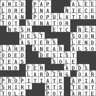 ACROSS 1. Among 5. Infant food 8. Toward shelter 12. Old wives' tales, e.g. 13. _ tizzy (2 wds.) 14. Sibling's daughter 15. SW Asia republic 16. Census information 19. Small child 20. Legislator 21. Delicate 23. And so on (abbr.) 24. Born 27. Behest 30. Within a short period 31. Michaelmas daisies 34. Grant temporary use of 35. Cowardly lion portrayer 38. Approach 40. In addition 41. Wrote a lyric poem 42. Cease 44. Beverages made from leaves 45. Flatfish 46. Also 47. Opposite of masc. 50. Does sums 53. Preparing or cooking with lard 57. Rowing implement 59. Appease 63. Capital of Western Samoa 64. Chest covering 65. Mountains (abbr.) 66. Portable shelter 67. Lacquered or enameled metalware 68. Cooking vessel 69. Johnson of "Laugh-In" DOWN 1. Came down and settled, as after flight 2. Person of subnormal intelligence 3. Feeling or showing extreme anger 4. Lair 5. Corncob 6. Soon (poet.) 7. Dad 8. Small island 9. Flowery wreath 10. Environmental prefix 11. Car or cant ending 14. Drug cop 17. Shoshoni 18. Car dealer's back yard 20. "______ My Girl" (Turtles hit) 22. Broken pieces 24. Christmas carol 25. Immeasurably long periods of time 26. Inside; within (prefix) 28. R.R. building 29. Watch over 30. Scheduled 32. To separate or throw off 33. Backtalk 35. Globular water bottle used in Asia 36. Arabian gulf 37. Froth on beer 39. River (Sp.) 43. Volcanic refuse 47. Sudden quick movement 48. Ingest 49. Medical imaging device (abbr.) 51. Drug addict 52. Inhabitant of Heaven 54. Moist 55. "Tell ____ the Marines!" 56. A home for chicks 58. Assign a rank or rating to 59. Pacific Standard Time (abbr.) 60. 17th letter of the Greek alphabet 61. Lubricate 62. Before (prefix) 63. _ moment's notice (2 wds.)