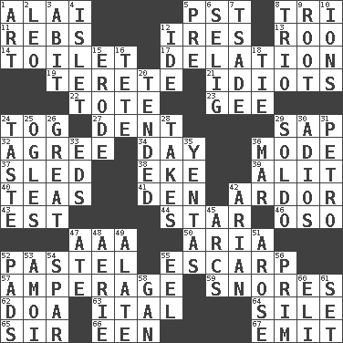 ACROSS 1. Jai _ 5. Pacific Standard Time (abbr.) 8. Three (prefix) 11. Confederate soldiers (slang) 12. Angers 13. Friend of Pooh 14. Bathroom 17. Conveyance 19. Cylindrical with tapered ends 21. Foolish or stupid persons 22. Carryall 23. Turn to the right 24. Coat; cloak 27. Undesirable depression on a surface 29. Plant excrement 32. Match 34. 24 hours 36. Method 37. Downhill vehicle 38. Supplement with great effort 39. Set down 40. Beverages made from leaves 41. Lair 42. Zeal 43. Eastern Standard Time (abbr.) 44. Play the lead 46. Bear (Spanish) 47. American Automobile Association (abbr.) 50. Operatic vocal solo 52. Soft color 55. Fortification 57. Electrical Measurement 59. Sounds asleep 62. ___ good deed 63. Slanted text style (abbr.) 64. Drop; flow; fall 65. Title for a knight 66. Car or cant ending 67. Send forth DOWN 1. Tate display 2. Lion 3. "This won't hurt ____!" 4. Small island 5. Before (prefix) 6. Former Milwaukee Brewers owner Bud 7. Sadhe (variant) 8. Musical group of three 9. Carrot, for example 10. Charged atoms 12. Binary compound 15. Eat (away) 16. False hair 18. Standoff 20. Watched over 24. Clothes sense 25. Stares at amorously 26. Relatively large 28. Receives possession of 29. Twentieth part of a lira 30. Goodbye (Sp.) 31. Stone: prefix 33. Begley and Asner 35. Gossips 36. Make imperfect 42. Believer in; advocate of (suffix) 45. Arches 47. Had dinner 48. Nest on high 49. Having winglike extensions 51. Came up 52. Groovy apts. 53. Mine, in Marseilles 54. Practice fight 55. Snakelike fish 56. Demure 58. Separate the seeds from cotton 60. Connecticut Ivy Leaguer 61. Arrange properly for use