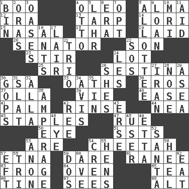 ACROSS 1. Surprise greeting 4. Margarine 8. _ mater 12. Lyricist Gershwin 13. Canvas cover 14. Australian parrot (variant) 15. Rhinal 18. Not this but _ 19. Put down 20. Legislator 22. Manchild 23. Use a spoon 24. Car dealer's back yard 25. _ Lanka 26. French poetic form 30. Girls' org. (abbr.) 33. Curses 36. Greek god of love 37. Water jar 39. Compete 40. Relaxation 41. Inside of hand 42. Wash lightly 44. Teachers' org. 45. Paper fasteners 47. Regret 50. Sight organ 51. Fast planes 53. "We ___ not amused" (Victoria) 54. Leopard's kin 57. Inactive volcano in Sicily 59. Have the gumption 61. Indian princess (variant) 63. Toadlike animal 64. Baking chamber 65. Beverage made from leaves 66. Prong on a fork 67. Perceives with the eye 68. Keyboard modifier key DOWN 1. Storage container 2. Mouths or openings 3. Fertile tracts in a desert 4. "Beetle Bailey" pooch 5. Cowardly lion portrayer 6. Epoch 7. Choose 8. One to whom something is allotted 9. Grant temporary use of 10. Medical imaging device (abbr.) 11. Help 16. Pismires 17. Den 21. Musical group of three 22. Distress signal 24. French article 26. "______ My Girl" (Turtles hit) 27. SW Asia republic 28. Characteristic smell of wine 29. At sea 30. Republicans 31. Narrow board 32. Silent film actress Nazimova 34. Opinion 35. Shallow baking pan 38. Electrical Measurement 42. To separate or throw off 43. Celtic language 46. Potassium hydroxide 48. One who makes use of a thing 49. Singer James 52. Before Barbara or Clara 53. At once, immediately (arch.) 54. Algonquian 55. Coop moms 56. Person who is morally reprehensible 57. Lizard (obsolete) 58. Three (prefix) 59. Two (Sp.) 60. "___ Maria" 62. Erode