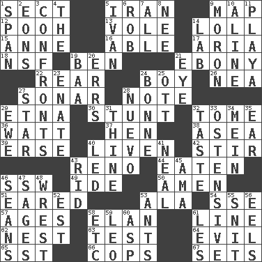 ACROSS 1. Religious group 5. SW Asia republic 9. Atlas unit 12. "Silly old bear" 13. Short-tailed, large-bodied rat 14. Hang loosely or laxly 15. Queen of England 1702-14 16. Competent 17. Operatic vocal solo 18. Science/research agcy. 19. Benjamin's nick name 21. Dark wood 22. Bring up, as a child 24. Male child 26. Teachers' org. 27. Underwater navigation system 28. Observe 29. Inactive volcano in Sicily 30. Difficult or unusual or dangerous feat 32. Heavy book 36. Electrical Unit 37. Layer 38. Toward the sea 39. Celtic language 40. Make or become more lively 42. Tumult 43. Former U.S. Attorney General Janet 44. Eroded 46. Compass dir. 49. Binary compound 50. So be it 51. Having ears or earlike features 53. Insect wing 54. Compass dir. 57. Matures 58. Liveliness 61. Actor's bit 62. Egg locale 63. Trial 64. Morally bad or wrong 65. Fast jet (abbr.) 66. 911 reaches them 67. Arranges properly for use DOWN 1. Connect, as a bridge 2. Immeasurably long periods of time 3. Meets 4. Definite Article 5. "Terrible" tsar 6. Director Reiner 7. 100% 8. Born 9. Person of subnormal intelligence 10. Place in a line 11. Beach, in Buenos Aires 14. Experiment locale 19. Sound made by sheep 20. Blunders 21. Sight organ 23. Related on the mother's side 24. Maid-servant 25. Baseball player Mel 27. Play the lead 28. New (sp.) 29. She-sheep 31. One or ones belonging to thee 32. Clothes sense 33. Clearly or manifestly demonstrative 34. Count _ (2 wds.) 35. Ewer handle 40. Directed 41. Anneal 43. To free from 45. Housemaid (var.) 46. Actors Connery and Penn 47. Gurus 48. Obtain by seizing forcibly or violently 52. Eastern Standard Time (abbr.) 53. Pismires 55. In a ____ (agitated or irritated) 56. Snakelike fish 58. And so on (abbr.) 59. Lion 60. Viper 61. French article