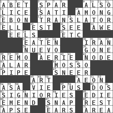ACROSS 1. Collude with 5. Practice fight 9. In addition 13. Louse (plural) 14. Suttee (variant) 15. Amid 16. Inky black, to poets 17. Interpreter 19. Pipe bend 20. Eastern Standard Time (abbr.) 21. Observe 22. Deep reverence 23. Snakelike fish 25. And so on (abbr.) 26. Consumed 30. SW Asia republic 34. New (sp.) 35. Went 36. San ____ (Riviera town) 39. Nest on high 42. Thickened enlargement 43. Having or resembling wings 44. With motion or animation 46. Corncob 47. Contemptuous expression 48. Tate display 51. A really long time 54. White ___ sheet 57. Compete 58. Fluid product of inflammation 60. Two (Sp.) 62. Seigniories (variant) 65. Singer Brickell 66. Make improvements or corrections to 67. Fastener 68. State of inaction 69. Domed church section 70. Hearing organs 71. Length times width DOWN 1. Toward shelter 2. The Good Book 3. Learning spot: Fr. 4. Nine, plus one 5. Fast planes 6. Component 7. "One Day ___ Time" 8. Remove soap 9. Housemaid (var.) 10. Globular water bottle used in Asia 11. Frozen precipitation 12. Legendary monster 15. Actor Baldwin 18. Arrange properly for use 20. Son of Isaac 24. Poe poem 27. Afternoon social gathering 28. First lady 29. Typical standards 30. Snub 31. Friend of Pooh 32. Plus 33. Born 36. Hit sharply and swiftly 37. Connecticut Ivy Leaguer 38. Atlas unit 40. Electrically charged atom 41. Compass dir. 45. Oceans 48. Enthusiastic 49. River (Sp.) 50. Laconic 52. More peculiar 53. Annoying sound 54. At sea 55. Simple or foolish person 56. Matures 58. Lightbulb-shaped fruit 59. United States Postal Service (abbr.) 61. Stalk of a moss capsule 63. Compass dir. 64. _ tizzy (2 wds.) 65. Period