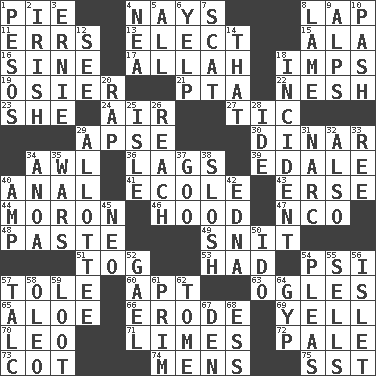 ACROSS 1. Sliced dessert 4. Negative votes 8. Pet locale 11. Blunders 13. Opt 15. According to 16. Trig term 17. Assad's deity 18. Naughty children 19. Flexible twig of a willow tree 21. Parent Teacher Association (abbr.) 22. Tender 23. A female animal or person 24. Atmosphere 27. Nervous spasm 29. Domed church section 30. Middle Eastern gold or silver currency 34. Leather borer 36. Falls behind 39. Peak District village in England 40. Of or related to the anus 41. Learning spot: Fr. 43. Celtic language 44. Person of subnormal intelligence 46. Parka part 47. Non-commissioned officer (abbr.) 48. Thick mixture 49. In a ____ (agitated or irritated) 51. Coat; cloak 53. Possessed 54. Air pressure measure (abbr.) 57. Lacquered or enameled metalware 60. Fitting 63. Stares at amorously 65. _ vera 66. Wear away 69. Shout 70. Lion 71. Citrus fruits 72. Diluted with white 73. Small bed 74. Not women's 75. Fast jet (abbr.) DOWN 1. Mexican monetary units 2. From or relating to Ireland 3. Bert's buddy 4. Teachers' org. 5. Everything 6. Sharp bark 7. Scram! 8. Unable to walk 9. High mountains 10. Romantic infatuation 12. Perceive with the eye 14. Not this but _ 18. Event 20. Reproach for some lapse or misdeed 25. Capri or Wight 26. Arrive at 28. Binary compound 29. One to whom something is allotted 31. Drug cop 32. In addition 33. Portuguese money of account (variant) 34. Small Philippine buffalo 35. Armed conflicts 37. Thick or sticky substance 38. Agitate, as a liquid 40. Electrical Unit 42. Pulitzer Prize-winning author Ferber 45. Modern: prefix 50. Wedding promise 52. Highlander 54. Entreaties 55. Makes a sale 56. Small island 57. Baby powder 58. Margarine 59. Plunder 61. Demure 62. Heavy book 64. Flimflam 67. Lair 68. Curvy letter
