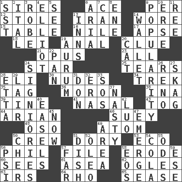 ACROSS 1. Fathers 6. Adept person 9. For each 12. Took without asking 13. SW Asia republic 14. Had on 15. Eating place 16. "Death on the ____" 17. Domed church section 18. Luau accessory 19. Of or related to the anus 20. A slight indication 21. Musical composition 23. 100% 24. Play the lead 25. Rends 28. Connecticut Ivy Leaguer 30. Unclothed pictures 34. Long journey 35. Label 36. Person of subnormal intelligence 38. _ tizzy (2 wds.) 39. Prong on a fork 41. Rhinal 43. Coat; cloak 44. Believer in; advocate of (suffix) 46. Chop _ 48. Bear (Spanish) 49. Smallest unit of an element 50. Group working together 51. Rowboat 53. Environmental prefix 56. Silvers or Donahue 57. Do some clerical work 58. Wear away 60. Perceives with the eye 61. Toward the sea 62. Stares at amorously 63. Big collection agency 64. 17th letter of the Greek alphabet 65. Gospel singer Marvin DOWN 1. Fast jet (abbr.) 2. Slanted text style (abbr.) 3. Loose flowing garment 4. American author Paul (1891-1958) 5. Perceive with the eye 6. Operatic vocal solo 7. Give a ring to 8. Compass dir. 9. Teen's desire 10. Celtic language 11. To separate or throw off 13. Restaurants 14. Place for singles 19. Gold (Symbol: Au) 20. Domesticated feline 22. Baking dish 24. Seigniories (variant) 26. Former U.S. Attorney General Janet 27. Heroin 28. Singer James 29. Den 31. Spanish title 32. Epoch 33. Distress signal 37. Offensive 40. Artist's stands 42. Nilotic language 45. Immediately 47. Develop 49. Length times width 50. "Mermaids" star 51. Food container 52. Margarine 54. Root beer relative 55. Lyric poems 56. 23rd letter of the Greek alphabet 57. At a great distance 58. Greek goddess of the dawn 59. Compass dir.