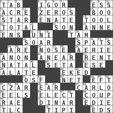 ACROSS 1. Bar bill 4. Russian composer Stravinsky 8. Double-curved letter 11. 43,560 square feet 13. Nothings 15. Sometimes accompanies a hiss 16. Play the lead 17. Related on the mother's side 18. Instrument 19. Add up to 21. Male offspring 22. Queen of England 1702-14 23. Followers of ems 24. University (slang) 27. Scottish cap 29. Fly high 30. Arguments over trivial matters 34. "We ___ not amused" (Victoria) 36. Olfactory organ 39. Nest on high 40. At once, immediately (arch.) 41. Approach 43. Monthly bill 44. Relating to or accompanying birth 46. Bristle 47. Compass dir. 48. Having winglike extensions 49. Made supply last 51. Order of Saint Francis (abbr.) 53. Remaining after all deductions 54. Bank Draft (abbr.) 57. Russian ruler of old 60. Hearing organ 63. Monte _, Las Vegas Hotel/Casino 65. Snakelike fish 66. Choose 69. Clever action or accomplishment 70. Actress Charlotte 71. Middle Eastern gold or silver currency 72. Singer Brickell 73. Affectionate concern, for short 74. Native american tent (variation) 75. Begley and Asner DOWN 1. Clothes sense 2. NE Massachussets city 3. Naughty children 4. Ending with capital 5. Commissioned military rank (abbr.) 6. Mouths or openings 7. Printing process, for short 8. Inky black, to poets 9. Within a short period 10. Flatfish 12. Period 14. Posted 18. ________ with (broke a safety seal) 20. Nilotic language 25. Nanny 26. Removes the wrinkles 28. White ___ sheet 29. Elected representatives 31. Ancient Greek god of war 32. Prong on a fork 33. Arrange properly for use 34. Of or related to the anus 35. Roll call or roster of names 37. Observe 38. Eroded 40. Santa ___, CA 42. Immoral or dissolute person 45. French article 50. And so on (abbr.) 52. Nourish 54. Wear away 55. Watery 56. Drinks excessively 57. Certainty 58. Ardor 59. Actor Baldwin 61. Came down and settled, as after flight 62. Painter Guido (1575-1642) 64. Adept person 67. Head covering 68. Three (prefix)