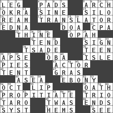ACROSS 1. Part of a journey 4. Groovy apts. 8. Bowlike part 12. Gumbo ingredient 14. Trig term 15. Grain storage tower 16. 480, 500 or 516 sheets of paper 17. Interpreter 20. Pulitzer Prize-winning author Ferber 21. ___ good deed 22. Accounting whiz (abbr.) 23. One or ones belonging to thee 27. Brightly colored fish 29. Be inclined (to) 31. Attach a signature 34. Sadhe (variant) 35. Adolescent 36. Domed church section 39. Chief or king in Benin or Nigeria 41. Capri or Wight 42. Sliced desserts 43. Thespian 46. Portable shelter 47. Pate de foie ____ 48. Toward the sea 51. Dark wood 54. Sep. follower 56. Mouth edge 58. Pledge 61. Appease 66. Musical group of three 67. Pacific island yam 68. It was, poetically 69. Conclusions 70. System (abbr.) 71. Equivocates 72. Observe DOWN 1. Old wives' tales, e.g. 2. Supplemented with great effort 3. Let have 4. Pacific Standard Time (abbr.) 5. Wind 6. Heredity factor (abbr.) 7. Transmit 8. White ___ sheet 9. Actors Guy, Robert Welles, and Clint 10. Hoof sound 11. Israeli folk dance 13. Nanny 18. "Barney Miller" actor Jack 19. Pet locale 24. It is 25. Teachers' org. 26. Inside; within (prefix) 28. Being in motion 30. Debunk (Brit. slang) 32. Set 33. Compass dir. 34. Trials 36. Fitting 37. Sliced dessert 38. Elected representatives 40. Measure of real estate 44. Bar bill 45. Bear (Spanish) 49. Biblical high priest 50. Small island 52. Observe 53. Tall tales 54. Elects 55. Supercomputer manufacturer 57. Heart or essence 59. Periodic rise and fall of the sea level 60. Flexible conduit 62. Cooking vessel 63. Deep reverence 64. Scottish cap 65. Curvy letter