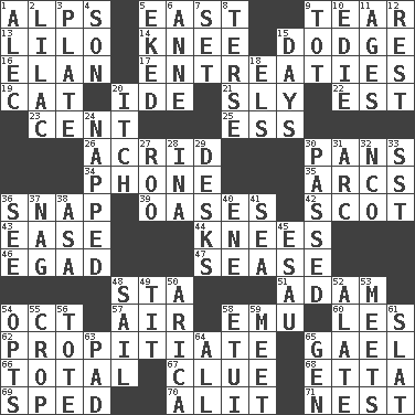 ACROSS 1. High mountains 5. 90 degrees 9. Rend 13. _ and Stitch 14. Leg joint 15. Evade 16. Enthusiasm 17. Pleas 19. Domesticated feline 20. Binary compound 21. Stealthy 22. Eastern Standard Time (abbr.) 23. Penny 25. Double-curved letter 26. Bitter 30. Baking dishes 34. Give a jingle 35. Curves 36. Fastener 39. Fertile tracts in a desert 42. Native of Scotland 43. Relaxation 44. Leg joints 46. Mild oath 47. Gospel singer Marvin 48. R.R. building 51. First of billions? 54. Sep. follower 57. Wind 58. Australian flightless bird 60. French article 62. Conciliate 65. Highlander 66. Add up to 67. A slight indication 68. Singer James 69. Broke a traffic law 70. Came down and settled, as after flight 71. Egg locale DOWN 1. Actor Baldwin 2. Pale purple color 3. Food holder 4. Male offspring 5. Made supply last 6. Singer Murray 7. Put into a specified state 8. Laconic 9. Small child 10. Singer Brickell 11. Grows older 12. Respite 15. 24-hour periods 18. Raised railways 20. Hankering 24. Slept 27. Friend of Pooh 28. _ tizzy (2 wds.) 29. Writing tables 30. Went by 31. Curve 32. Non-commissioned officer (abbr.) 33. Fast jet (abbr.) 36. Perceive with the eye 37. Tired old horse 38. White ___ sheet 40. Compass dir. 41. Ocean 45. Son of Isaac 48. Travel by water 49. Teat (slang) 50. N. Chile seaport 52. Having winglike extensions 53. Confronts 54. Elects 55. Riding implement 56. Haul 58. Needle case 59. Rendezvous 61. Narrow board 63. Groovy apt. 64. 100% 65. Commissioned military rank (abbr.)