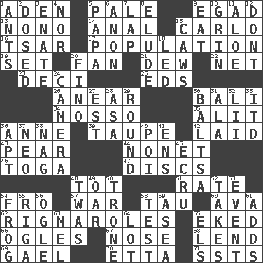ACROSS 1. Arabian gulf 5. Diluted with white 9. Mild oath 13. Words to Nanette 14. Of or related to the anus 15. Monte _, Las Vegas Hotel/Casino 16. Russian ruler of old 17. Census information 19. Put into a specified state 20. Air blower 21. Morning condensation 22. Remaining after all deductions 23. Tenth: prefix 25. Begley and Asner 26. Approach 30. Indonesian resort city 34. With motion or animation 35. Came down and settled, as after flight 36. Queen of England 1702-14 39. Grayish beige 42. Put down 43. Lightbulb-shaped fruit 44. Music written for nine 46. Ancient Roman robe 47. Flat circles 48. Small child 51. Assign a rank or rating to 54. From 57. Armed conflict 58. The 19th letter of the Greek alphabet 60. Actress Gardner 62. Frustrating wastes of time 65. Made supply last 66. Stares 67. Characteristic smell of wine 68. Grant temporary use of 69. Highlander 70. Singer James 71. Fast planes DOWN 1. Pismires 2. Administered medicine 3. Maternal 4. Not either 5. Dad 6. Soon (poet.) 7. Pet locale 8. Evade 9. Ingest 10. Smile widely 11. Medicinal plant 12. Do not 15. Crow sounds 18. Directed 20. Fine (Spanish) 24. Device for capturing images 27. Eastern Standard Time (abbr.) 28. White ___ sheet 29. One shot 30. Greek mezzo-soprano Agnes 31. According to 32. Cards in a Roman deck? 33. It would 36. Fitting 37. Modern: prefix 38. Tired old horse 40. Luau course 41. Followers of ems 45. Shade of tan 48. It was, poetically 49. Boat paddle 50. Marketplace scale 52. Receives possession of 53. Happening 54. Toadlike animal 55. Port city in Latvia 56. Stare 58. Trial 59. At sea 61. Sums up 63. Cartoonist voice _ Blanc 64. Car dealer's back yard 65. Raised railways
