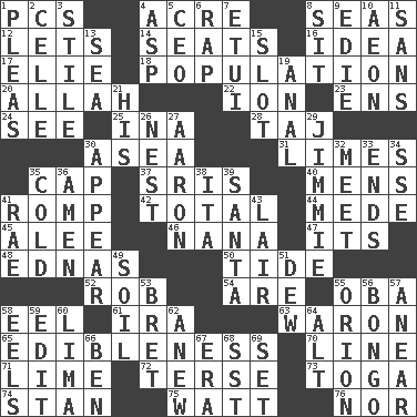 ACROSS 1. Personal Computers (abbr.) 4. 1/640 square mile 8. Oceans 12. Allows 14. Theater features 16. The content of cognition 17. Writer Wiesel 18. Census information 20. Assad's deity 22. Electrically charged atom 23. Followers of ems 24. Perceive with the eye 25. _ tizzy (2 wds.) 28. _ Mahal 30. At sea 31. Citrus fruits 35. Head covering 37. Indian titles of respect 40. Not women's 41. Play 42. "_____ Recall" 44. Ancient Persian 45. Toward shelter 46. Grandmother 47. ___ a Wonderful Life 48. Ferber et al. 50. Event that recurs at intervals 52. Director Reiner 54. "We ___ not amused" (Victoria) 55. Chief or king in Benin or Nigeria 58. Snakelike fish 61. Retirement account (abbr.) 63. Make _____ (do battle with) 65. The property of being fit to eat 70. Actor's bit 71. Citrus frut 72. Laconic 73. Ancient Roman robe 74. Comedian Laurel of Laurel & Hardy 75. Electrical Unit 76. And not DOWN 1. Entreaties 2. Cell (Danish) 3. Vertical member of a panel or frame 4. Viper 5. Corporate head (abbr.) 6. Hit sharply and swiftly 7. Needle holder 8. Be seated 9. Singer Brickell 10. A really long time 11. Without 13. Ocean 15. Notch 19. Of or related to the anus 21. Part of HMS, perhaps 26. A home for chicks 27. Composer Copland 29. Stevie Ray Vaughan's brother 30. Become visible 32. Rendezvous 33. Conclusions 34. Compass dir. 35. Having a low temperature 36. So be it 38. Call ___ day 39. Before Barbara or Clara 41. Actress Charlotte 43. Den 49. Earth 51. Morning condensation 53. Cy Young winner Saberhagen 55. Constellation of myth 56. Beat drum 57. Approach 58. Snakelike fish 59. Prepare for publication 60. Pale green bean 62. Afresh 64. Keyboard modifier key 66. Benjamin's nick name 67. Epoch 68. Fast jet (abbr.) 69. Put into a specified state