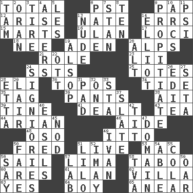 ACROSS 1. Add up to 6. Pacific Standard Time (abbr.) 9. Infant food 12. Ascend 13. Nathan's nickname 14. Blunders 15. Shops 16. Uhlan (variant) 17. Event scenes 18. Born 19. Arabian gulf 20. High mountains 21. Hero or heavy, e.g. 23. Cards in a Roman deck? 24. Fast planes 25. Hauls 28. Connecticut Ivy Leaguer 30. Traditional theme or motif 34. Event that recurs at intervals 35. Label 36. Leg coverings 38. Small island 39. Prong on a fork 41. Started a card game 43. Beverage made from leaves 44. Believer in; advocate of (suffix) 46. Assistant 48. Bear (Spanish) 49. "Tell ____ the Marines!" 50. Flintstone 51. Not recorded 53. Big _ 56. Move on water 57. Pale green bean 58. Off limits 60. Ancient Greek god of war 61. ____ Jay Lerner 62. Country residence 63. Consenting reply 64. Male child 65. Approach DOWN 1. Scottish cap 2. Northwest Algerian city 3. Hoop that covers a wheel 4. Michaelmas daisies 5. French article 6. Diluted with white 7. Comedian Laurel of Laurel & Hardy 8. Nine, plus one 9. Conciliate 10. Curves 11. Air pressure measure (abbr.) 13. Unadorned 14. American author Paul (1891-1958) 19. Columnist Joseph or Stewart 20. The first octave above the treble staff 22. Baseball player Mel 24. Seigniories (variant) 26. Singer Brickell 27. Stalk of a moss capsule 28. Singer James 29. Den 31. Groovy apt. 32. Single 33. R.R. building 37. Schedule 40. Artist's stands 42. Teat (slang) 45. Dreamland 47. Kingdom 49. _ the terrible 50. Conductor's collection 51. _ and Stitch 52. "If ____ say so..." 54. Competent 55. Root beer relative 56. Declare 57. Experiment locale 58. Federal power corp. 59. Rowing implement