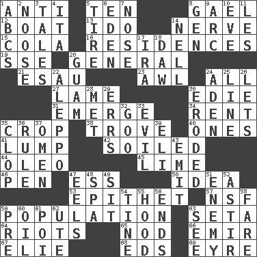 ACROSS 1. Opposed to 5. Nine, plus one 8. Highlander 12. Water vessel 13. Wedding promise 14. Boldness 15. Root beer relative 16. Homes 19. Compass dir. 20. Commissioned military rank 21. Son of Isaac 23. Leather borer 24. 100% 27. Unable to walk 30. Singer Brickell 31. Develop 34. Monthly bill 35. Riding implement 38. Collection of objects 40. Singles 41. Mass 42. Dirtied 44. Margarine 45. Citrus frut 46. Animal enclosure 47. Double-curved letter 50. It may be bright or harebrained 53. Curse 57. Overdraft (abbr.) 59. Census information 63. Bristle 64. Debaucheries 65. Dreamland 66. Arab leader 67. Writer Wiesel 68. Begley and Asner 69. Jane of fiction DOWN 1. Lettered men learn these first 2. Trap for birds or small mammals 3. Falsehoods 4. Call ___ day 5. Hoop that covers a wheel 6. Locale of original sin 7. Sense of smell 8. Commissioned military rank (abbr.) 9. Curve 10. Night before a holiday 11. French article 14. 1994 drama film starring Jodie Foster 17. Retirement account (abbr.) 18. Simpleton 20. Island territory of the United States 22. City in Syria 24. An important port of Yemen 25. Actor's bit 26. Allows 28. Was introduced to 29. Blunders 30. Eaten away 32. Thick or sticky substance 33. Morally bad or wrong 35. Hoof sound 36. Court order 37. Presage 39. Connecticut Ivy Leaguer 43. Give off 47. Snakelike fish 48. Health resort 49. Be seated 51. Foe 52. Moving or stirring 54. Prong on a fork 55. Parka part 56. Conclusions 58. Conductor's collection 59. Before (prefix) 60. Petroleum 61. Luau course 62. Shoshoni 63. Observe