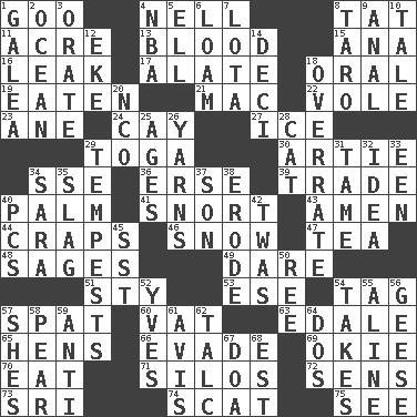 ACROSS 1. Thick or sticky substance 4. 1994 drama film starring Jodie Foster 8. Make lace 11. 43,560 square feet 13. Vital fluid 15. Santa ___, CA 16. Path through which fluid escapes 17. Having winglike extensions 18. Spoken 19. Eroded 21. Apple computer (short form) 22. Grand slam 23. One (Scot) 24. Island 27. Frozen water 29. Ancient Roman robe 30. Nick name for Arthur 34. Compass dir. 36. Celtic language 39. Buy and sell 40. Inside of hand 41. Derisive sound 43. So be it 44. Dice game 46. Frozen precipitation 47. Afternoon social gathering 48. Gurus 49. Have the gumption 51. Filthy place 53. Compass dir. 54. Label 57. Petty quarrel 60. Large container 63. Peak District village in England 65. Coop moms 66. Dodge 69. Migrant worker of the '30s 70. Ingest 71. Grain storage towers 72. Elected reps. 73. Indian title of respect (Mr.) 74. Scram! 75. Perceive with the eye DOWN 1. An organ shaped like a helmet 2. Sea 3. Speak pompously 4. Basketball assoc. 5. Pipe bend 6. Rich soil 7. Globular water bottle used in Asia 8. Pacific island yam 9. Of or related to the anus 10. Lie 12. Supplement with great effort 14. Tenth: prefix 18. Make much ado about nothing 20. Non-commissioned officer (abbr.) 25. Ripens 26. Tall tales 28. Domesticated feline 29. Storms 31. Not wild 32. It may be bright or harebrained 33. Car or cant ending 34. "Two Mules for Sister ____" 35. Volcanic refuse 37. Boy, to dad 38. Eat (away) 40. Personal Computers (abbr.) 42. It was, poetically 45. Fast jet (abbr.) 50. To riddle 52. Jacques Cousteau's middle name 54. Proceeds 55. Place in a line 56. Honkers 57. "______ My Girl" (Turtles hit) 58. Lightbulb-shaped fruit 59. Against 61. Opinion 62. Baby powder 64. Two (Sp.) 67. ___ good deed 68. Eastern Standard Time (abbr.)
