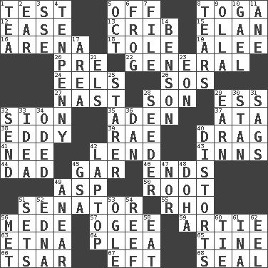 ACROSS 1. Trial 5. Not in operation 8. Ancient Roman robe 12. Comfort 13. Baby bed with high sides 15. Enthusiasm 16. Sports stadium 18. Lacquered or enameled metalware 19. Toward shelter 20. Before (prefix) 22. Commissioned military rank 24. Snakelike fish 26. Mayday 27. Political cartoonist Thomas 28. Manchild 29. Curvy letter 32. The Jewish people; Israel 35. An important port of Yemen 37. _ moment's notice (2 wds.) 38. Whirlpool 39. Actress Charlotte 40. To trail on the ground 41. Born 42. Grant temporary use of 43. Restaurants 44. Male parent 45. Slender fish 46. Conclusions 49. Viper 50. Carrot, for example 51. Elected representative 55. 17th letter of the Greek alphabet 56. Ancient Persian 57. Double curve, resembling the letter S 59. Nick name for Arthur 63. Inactive volcano in Sicily 64. Entreaty 65. Prong on a fork 66. Russian ruler of old 67. Lizard (obsolete) 68. Lick closed DOWN 1. Afternoon social gathering 2. Hearing organ 3. Compass dir. 4. 3-inch nail 5. Sep. follower 6. Tree-dwelling hopper 7. Do some clerical work 8. Rends 9. Spanish pot 10. Highlander 11. A saturated hydrocarbon 14. Gillaume's butler role 17. Type of rug 21. Raised railways 23. Period of immesurable duration 25. A viewer who gazes fixedly 28. Sowing specialist 29. Merit 30. Comedian Laurel of Laurel & Hardy 31. Settles 32. Transmit 33. The main thing one is thinking about 34. Wrote a lyric poem 36. One of the 12 tribes of Israel 40. What propaganda does 42. Portable computer 45. Girls' org. (abbr.) 47. Not either 48. Capital of the state of Qatar 49. Approach 51. Puts into a specified state 52. Pulitzer Prize-winning author Ferber 53. Stare at amorously 54. Coral ridge 56. Was introduced to 58. Ingest 60. Standoff 61. _ tizzy (2 wds.) 62. Snakelike fish