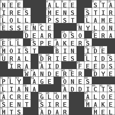 ACROSS 1. Born 4. Toward shelter 8. R.R. building 11. Angers 13. Not women's 14. Tumult 15. Hang loosely or laxly 16. Inconspicuous attention getter 17. Unable to walk 18. Gist 21. Thermoplastic polyamide 22. Letter starter 23. Bear (Spanish) 25. Epoch 26. Pipe bend 29. Orators 32. Damp 34. Storage container 35. Binary compound 38. Mountain range 39. Frees from moisture 41. Flaplike coverings 43. Retirement account (abbr.) 44. Assist 45. Gives food to 46. Nomad 50. Color 51. Travel a route regularly 54. Ripen 55. Washington bills 57. Climbing, woody, usually tropical vines 59. Inveterate users 63. Measure of real estate 64. Take by theft 67. Medicinal plant 68. Emitted 69. Beget 70. Cause to be 71. Mountains (abbr.) 72. The sixth month of the Jewish calendar 73. Cartoonist voice _ Blanc DOWN 1. The longest river in the world 2. Greek god of love 3. Snakelike fish 4. Electrical Unit 5. French article 6. Followers of ems 7. Eastern Standard Time (abbr.) 8. Lacking originality or spontaneity 9. Southeast Indonesia island 10. Sports stadium 12. Downhill vehicle 14. Playfully artful 19. Egg locale 20. Head covering 21. And not 23. Migrant worker of the '30s 24. Elected reps. 26. Australian flightless bird 27. Australian parrot (variant) 28. One who doesn't tell the truth 30. Tolerate 31. Drop; flow; fall 33. Cole _ (cabbage dish) 36. Passed on 37. Whirlpool 39. Mild oath, euphamism for damn 40. Travel on an animal 42. Compass dir. 45. Flintstone 47. Auto club (abbr.) 48. Nomad 49. Conclusion 51. Suffix with ecto or cyto 52. It is permitted: Lat. 53. Tall tales 56. Thailand, formerly 58. Fish or hair follower 60. Dollar (slang) 61. Puff or smoke 62. Stitch closed the eyes of (a falcon) 64. Girls' org. (abbr.) 65. Flaplike covering 66. Mouth or opening