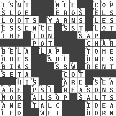 ACROSS 1. Is not 5. Born 8. Police officer (slang) 11. _ gin 12. Greek god of love 14. Raised railways 15. Plunders 17. Tall tales 18. French article 19. Core 21. Fast jet (abbr.) 22. Car dealer's back yard 23. Definite Article 24. Electrically charged atom 25. Plant excrement 27. Cooking vessel 28. Burn to charcoal 31. Actor Lugosi 35. Infant locale 37. Heavy book 38. Lyric poems 39. Take to court 41. Singles 42. Prejudice 43. Compass dir. 45. Monthly bill 46. Bristle 47. Small bed 49. Part of HMS, perhaps 51. "We ___ not amused" (Victoria) 52. Ocean 55. Personal question 57. 23rd letter of the Greek alphabet 60. Thinks logically 62. And not 63. Columnist Joseph or Stewart 65. Table seasonings 66. A saturated hydrocarbon 67. Baby powder 68. The main thing one is thinking about 69. Directed 70. Dripping 71. Dormintory (informal) DOWN 1. Small island 2. Agitate, as a liquid 3. Trap for birds or small mammals 4. Wig 5. Teachers' org. 6. Blunders 7. Immeasurably long periods of time 8. Portable communications device 9. Margarine 10. Inconspicuous attention getter 13. Fast planes 16. Clip 17. Gossips 20. Calm and collected 26. Thespian 29. So be it 30. Repose 31. Moves up and down 32. Singer Brickell 33. Resembling or made to resemble leather 34. Slender Brazilian palm 36. Product of festering 40. Fortification 44. Had on 48. Beverages made from leaves 50. Argument over a trivial matter 52. Twentieth part of a lira 53. Keyboard key 54. Indian state 55. Of or related to the anus 56. Went 58. Cole _ (cabbage dish) 59. Small island 61. Expressed in words 64. Sep. follower