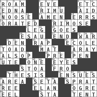 ACROSS 1. Wander 5. Night before a holiday 8. And so on (abbr.) 11. Pulitzer Prize-winning author Ferber 12. Tall New Zealand timber tree 14. Help 15. Trap for birds or small mammals 17. So be it 18. Blunders 19. Declaimed 21. Full of chinks, cracks, or crevices 23. Part of a journey 25. Moves 26. Son of Isaac 27. Conclude 28. Armed conflict 31. Lair 33. Hit sharply and swiftly 35. Learning spot: Fr. 37. Frog relative 38. Floor covering 40. Like ___ of sunshine 41. Columnist Joseph or Stewart 43. Before (prefix) 45. Writing instrument 46. Shoshoni 47. Single 50. Sight organs 52. Portico 53. From 54. College paper 56. Takes place subsequently 61. Type of rug 62. Bristle 65. Small fatty European fish 66. To separate or throw off 67. Liveliness 68. Legendary monster 69. Snakelike fish 70. R.R. building 71. Portable shelter DOWN 1. Western Nevada city 2. Aroma 3. Small Philippine buffalo 4. Vertical spar for supporting sails 5. Period 6. Zeal 7. Develop 8. Hearing organs 9. Become fatigued 10. Music discs 13. The state of being joined or united 16. Snakelike fish 18. Greek goddess of the dawn 20. Letter starter 22. Ancient Persian 24. Island territory of the United States 26. Inside; within (prefix) 28. Had on 29. ____ Jay Lerner 30. Marina Del _, California 31. Stupid person 32. Comfort 34. Infant food 36. Smile enhancers 37. The 19th letter of the Greek alphabet 39. Unclean, religiously 42. Plant holders 44. Jane of fiction 48. Annoying sound 49. Artist's stands 51. Immeasurably long periods of time 52. Ocean 54. Family _ (genealogy) 55. Person who is morally reprehensible 57. Blemish 58. Goad 59. Merit 60. Proofreading order 61. "We ___ not amused" (Victoria) 63. Make lace 64. Santa ___, CA