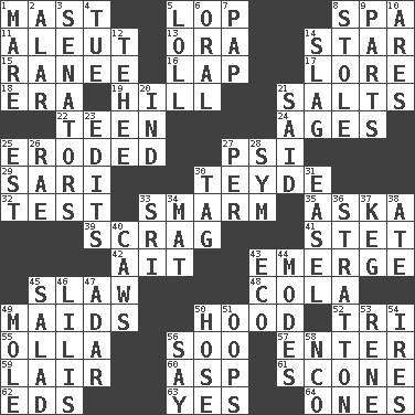ACROSS 1. Vertical spar for supporting sails 5. Trim (branches) 8. Health resort 11. Eskimo relative 13. Mouth or opening 14. Play the lead 15. Indian princess (variant) 16. Infant locale 17. Old wives' tales, e.g. 18. Epoch 19. Land elevation 21. Table seasonings 22. Adolescent 24. Eons 25. Worn away 27. 23rd letter of the Greek alphabet 29. Indian skirt 30. Miss Universe 1986, Barbara Palacios _ 32. Trial 33. Excessive but superficial compliments 35. "____ silly question..." 39. Strangle with an iron collar 41. Proofreading order 42. Small island 43. Develop 45. Cole _ (cabbage dish) 48. Root beer relative 49. Women servants 50. Parka part 52. Three (prefix) 55. Spanish pot 56. "Barney Miller" actor Jack 57. Keyboard key 59. Den 60. Cleo's killer 61. Biscuitlike quick bread 62. Begley and Asner 63. It is so 64. Singles DOWN 1. Female horse 2. Having or resembling wings 3. Elected representatives 4. Third day of the wk. 5. Hang loosely or laxly 6. Of the mouth 7. Infant food 8. Took without asking 9. Components 10. Ancient Greek god of war 12. Giggle 14. Volcanic refuse 20. Working for oneself (abbr.) 21. Stated 23. Proofreads 25. Eastern Standard Time (abbr.) 26. Actress Charlotte 27. For each 28. Symbol (abbr.) 30. Label 31. Artist's stand 33. _ Lanka 34. Floor covering 36. Ski resort town in Vermont 37. Cask 38. Had dinner 40. Crow sounds 43. Environmental prefix 44. Methods 45. Vegetable dish 46. Ms. Damita and namesakes 47. The sixth month of the Jewish calendar 49. Undercover agent 50. Stockings 51. I made a mistake 53. French philosopher Descartes 54. Angers 56. Declare 58. Non-commissioned officer (abbr.)