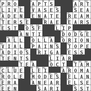ACROSS 1. Adept person 4. Flats, for short 8. Tate display 11. Not recorded 13. Flower holders 15. Ocean 16. An important port of Yemen 17. Maternal 18. 480, 500 or 516 sheets of paper 19. Laconic 21. Actress Charlotte 22. Hearing organs 23. Eastern Standard Time (abbr.) 24. Order of Saint Francis (abbr.) 27. Mouth edge 29. Opposed to 30. Evade 34. Everything 36. Spanish pot 39. Greek mythologigal hunter 40. Small bottle 41. Aches 43. Drink excessively 44. Goodbye (Sp.) 46. Capital of Latvia 47. Double-curved letter 48. Portable shelters 49. One who doesn't tell the truth 51. Beverage made from leaves 53. Sep. follower 54. Scottish cap 57. A slight indication 60. Luau accessory 63. Odor 65. Hero or heavy, e.g. 66. Methods 69. Liveliness 70. Period 71. Approach 72. Otherwise 73. Car or cant ending 74. Indian skirt 75. Fast jet (abbr.) DOWN 1. Food holder 2. Amusement-park features 3. Unconcealed 4. "___ Maria" 5. Baking dish 6. Russian ruler of old 7. Bristle 8. Toward the sea 9. Hitchcock's "____ Window" 10. Scottish caps 12. Followers of ems 14. Sew up the eyelids of hawks and falcons 18. News announcer 20. A really long time 25. Constrict 26. Having threads 28. Wedding promise 29. One to whom something is allotted 31. "Vaya con ____" 32. Republicans 33. Compass dir. 34. Helper 35. (Had) reclined 37. Cards in a Roman deck? 38. White American of non-Hispanic descent 40. Large container 42. Ketch in the Levant 45. Compass dir. 50. _ moment's notice (2 wds.) 52. _ mater 54. For Whom the Bell _____ 55. Collect or gather 56. French painter Edouard 57. Algonquian 58. Old wives' tales, e.g. 59. ____ Bator 61. Immeasurably long periods of time 62. It may be bright or harebrained 64. To riddle 67. Ewer handle 68. _ Lanka