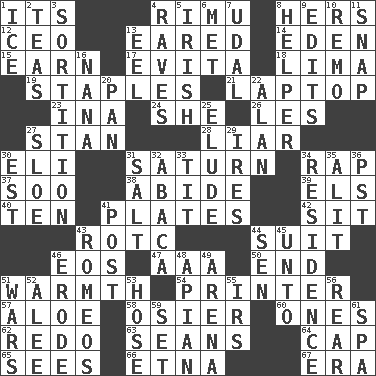 ACROSS 1. It is 4. Tall New Zealand timber tree 8. Possessive pronoun 12. Corporate head (abbr.) 13. Having ears or earlike features 14. Locale of original sin 15. Merit 17. Webber/Rice musical 18. Pale green bean 19. Paper fasteners 21. Portable computer 23. _ tizzy (2 wds.) 24. A female animal or person 26. French article 27. Comedian Laurel of Laurel & Hardy 28. One who doesn't tell the truth 30. Biblical high priest 31. Titan orbits this 34. Strike 37. "Barney Miller" actor Jack 38. Remain 39. Raised railways 40. "___ Little Indians" 41. Food holders 42. Be seated 43. College mil. group 44. Set of matching outer garments 46. Greek goddess of the dawn 47. Auto club (abbr.) 50. Conclude 51. Heat 54. Hard copy producer 57. Medicinal plant 58. Flexible twig of a willow tree 60. Singles 62. Make new 63. Actors Connery and Penn 64. Head covering 65. Perceives with the eye 66. Inactive volcano in Sicily 67. Period DOWN 1. Frozen water 2. Afternoon social gatherings 3. Making a chance decision by using lots 4. All-night dance parties 5. From or relating to Ireland 6. Was introduced to 7. Freehold land 8. Assistant 9. Proofreads 10. San ____ (Riviera town) 11. Fastener 13. Snakelike fish 16. Grandmother 20. Baking dish 22. ____ Jay Lerner 25. Evade 27. A type of plum 29. Angers 30. Eastern Standard Time (abbr.) 31. Table seasoning 32. Phillipine bananalike plant 33. Teat (slang) 34. Home 35. Came down and settled, as after flight 36. Pacific Standard Time (abbr.) 41. Mail 43. Lover boys 44. Elected rep. 45. To (old English) 46. Wear away 48. Bee-related 49. Sports stadium 51. Armed conflicts 52. Toward shelter 53. Flexible conduit 55. Big collection agency 56. Bring up, as a child 59. Arrange properly for use 61. Health resort