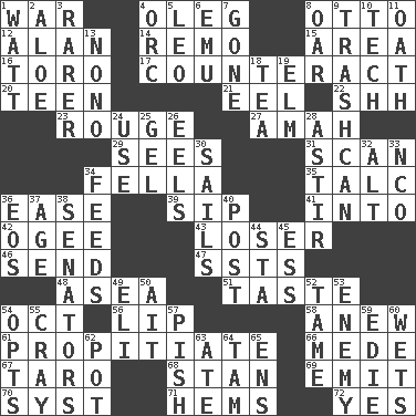 ACROSS 1. Armed conflict 4. Cassini of fashion 8. "Beetle Bailey" pooch 12. Actor Alda or Thicke 14. San ____ (Riviera town) 15. Length times width 16. "Corrida" creature 17. Neutralize 20. Adolescent 21. Snakelike fish 22. Quiet! 23. Makeup applied to the cheeks 27. Nanny 29. Perceives with the eye 31. Skim 34. Chap (slang) 35. Baby powder 36. Comfort 39. Small drink 41. To the inside or interior of 42. Double curve, resembling the letter S 43. Failure 46. Post 47. Fast planes 48. At sea 51. Clothes sense 54. Sep. follower 56. Mouth edge 58. Afresh 61. Conciliate 66. Ancient Persian 67. Edible starchy tuberous root 68. Comedian Laurel of Laurel & Hardy 69. Send forth 70. System (abbr.) 71. Folds over and sews together 72. Affirmative reply DOWN 1. Electrical Unit 2. Medicinal plant 3. More uncommon 4. The grampus (Milton) 5. Lion 6. Australian flightless bird 7. Went 8. Boat paddle 9. File 13 10. Technical work 11. Pledge 13. Words to Nanette 18. Afternoon social gathering 19. Shade tree 24. Purpose 25. Set 26. Snakelike fish 28. Moving or stirring 30. Moves on water 32. Keyboard modifier key 33. Non-commissioned officer (abbr.) 34. Gives food to 36. Greek goddess of the dawn 37. Mature 38. Elected representatives 40. Mail 44. R.R. building 45. Double-curved letter 49. Biblical high priest 50. Small island 52. Docile 53. Foe 54. Chooses 55. Supercomputer manufacturer 57. Expression of disdain 59. Singer Brickell 60. Moistens 62. Cooking vessel 63. Had dinner 64. Scottish cap 65. Followers of ems