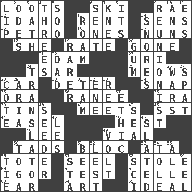 ACROSS 1. Plunders 6. What Jean-Claude Killy likes to do 9. Actress Charlotte 12. Potato state 13. Monthly bill 14. Elected reps. 15. Stone: prefix 16. Washington bills 17. Religious women 18. A female animal or person 19. Pace 20. Went 21. Dutch treat 23. RI univ. 24. Russian ruler of old 25. Catcalls? 28. 4-wheeled motor vehicle 30. Prevent from occurring 34. Fastener 35. Mouth or opening 36. Indian princess (variant) 38. Lyricist Gershwin 39. Metal containers 41. Confronts 43. Fast jet (abbr.) 44. Artist's stand 46. Behest 48. Area sheltered from the wind 49. Small bottle 50. Bits 51. Coalition 53. _ moment's notice (2 wds.) 56. Carry 57. Sew up the eyelids of hawks and falcons 58. Took without asking 60. Russian composer Stravinsky 61. Trial 62. Cell (Danish) 63. Hearing organ 64. Tate display 65. Perfect DOWN 1. Mouth edge 2. Lyric poems 3. Pledge 4. Threesomes 5. "Barney Miller" actor Jack 6. Emitted 7. Leg joint 8. It is 9. One who advocates reunion 10. Singer Murray 11. Double-curved letter 13. Wander 14. Sounds asleep 19. More uncommon 20. Chewing product 22. June honoree 24. Interpreter 26. Armed conflicts 27. Argument over a trivial matter 28. ____ d'Azur (French Riviera) 29. Operatic vocal solo 31. Scottish cap 32. Compass dir. 33. To riddle 37. Principle of right and wrong 40. Sowing specialist 42. Ocean 45. French article 47. Scheduled 49. Electrical Unit 50. Ancient Roman robe 51. Fermented drink made from hops 52. For fear that 54. Lacquered or enameled metalware 55. Silent film actress Nazimova 56. Neckwear 57. R.R. building 58. _-fi 59. Snakelike fish
