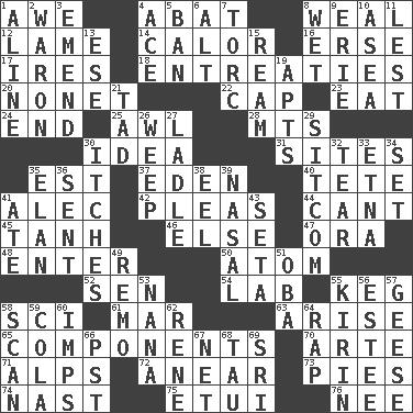 ACROSS 1. Deep reverence 4. Blind as ____ 8. Welt 12. Unable to walk 14. Bodily heat indicating an inflammation 16. Celtic language 17. Angers 18. Pleas 20. Music written for nine 22. Head covering 23. Ingest 24. Conclusion 25. Leather borer 28. Mountains (abbr.) 30. The main thing one is thinking about 31. Locates 35. Eastern Standard Time (abbr.) 37. Genesis locale 40. False hair 41. Actor Baldwin 42. Entreaties 44. Patter 45. Hyperbolic tangent 46. Otherwise 47. Mouth or opening 48. Keyboard key 50. Tiny particle 52. Elected rep. 54. Experiment locale 55. Barrel 58. _-fi 61. Third mo. 63. Originate 65. Parts 70. Johnson of "Laugh-In" 71. High mountains 72. Approach 73. Sliced desserts 74. Political cartoonist Thomas 75. Needle holder 76. Born DOWN 1. Place in a line 2. Make _____ (do battle with) 3. Make improvements or corrections to 4. Adept person 5. Prohibit 6. Keyboard modifier key 7. Torque (variant) 8. Soggy 9. 4th largest of the Great Lakes 10. At sea 11. For fear that 13. Compass dir. 15. 480, 500 or 516 sheets of paper 19. Tenement units (abbr.) 21. Small boy 26. Shed a tear 27. Dipping utensil 29. "Cheers" or "Ellen" 30. Irritating cutaneous sensations 32. Pull apart 33. Inactive volcano in Sicily 34. Arrange properly for use 35. Enthusiasm 36. Posted 38. Snakelike fish 39. Relating to the nose 41. Had dinner 43. Stalk of a moss capsule 49. San ____ (Riviera town) 51. Chief or king in Benin or Nigeria 53. Nanny 55. Japanese brewing company 56. First name in cosmetics 57. Honkers 58. Glance over 59. Root beer relative 60. Naughty children 62. French philosopher Descartes 64. Strike 66. Pacific Standard Time (abbr.) 67. Remaining after all deductions 68. The 19th letter of the Greek alphabet 69. _ Lanka