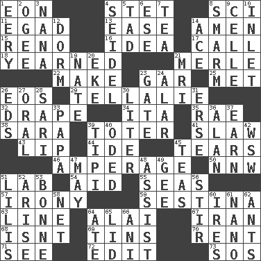 ACROSS 1. A really long time 4. Proofreading order 8. _-fi 11. Mild oath 13. Comfort 14. So be it 15. Former U.S. Attorney General Janet 16. The main thing one is thinking about 17. Give a ring to 18. Felt deep pity or tenderness 21. Haggard of country music 22. Cause to be 23. Slender fish 25. Was introduced to 26. Greek goddess of the dawn 29. Copy Pinocchio 32. Window treatment 34. Call ___ day 35. Actress Charlotte 38. "Two Mules for Sister ____" 39. Carrier 41. Cole _ (cabbage dish) 43. Mouth edge 44. Binary compound 45. Lacerates 46. Electrical Measurement 50. Compass dir. 51. Experiment locale 54. Assist 55. Oceans 57. Literary sarcasm 59. French poetic form 63. Actor's bit 64. Jai _ 67. SW Asia republic 68. Is not 69. Canisters 70. Monthly bill 71. Observe 72. Prepare for publication 73. Distress signal DOWN 1. Suggestive of the supernatural 2. Double curve, resembling the letter S 3. Nanny 4. Beer mug 5. Bit 6. Compass dir. 7. Beverage made from leaves 8. Excessive but superficial compliments 9. Cell (Danish) 10. An arm off of a larger body of water 12. Dormintory (informal) 14. Adept person 19. Nathan's nickname 20. Make supply last 21. Medical imaging device (abbr.) 23. Yard entry 24. Having or resembling wings 26. Begley and Asner 27. Spoken 28. Indian skirt 30. 61 cubic inches 31. Celtic language 33. Dad 36. ____ Jay Lerner 37. Merit 39. Native american tent (variation) 40. Wrote a lyric poem 42. Compass dir. 45. Afternoon social gatherings 47. Fifth month 48. Aid 49. Turn to the right 51. Ms. Damita and namesakes 52. Get up 53. Maid-servant 56. Tumult 58. Remaining after all deductions 60. Angers 61. Billionth: prefix 62. Pismires 64. Had dinner 65. Hat (slang) 66. Cuckoo