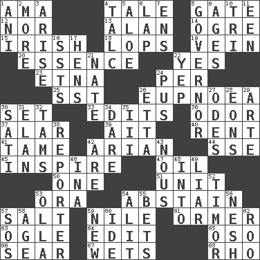 ACROSS 1. Nanny (var.) 4. Falsehood 8. Yard entry 12. Not either 13. Actor Alda or Thicke 14. Legendary monster 15. From or relating to Ireland 18. Chops off 19. Distinctive style or manner 20. Gist 22. It is so 23. Inactive volcano in Sicily 24. For each 25. Fast jet (abbr.) 26. Normal relaxed breathing 30. Put into a specified state 33. Prepares for publication 36. Scent 37. Having or resembling wings 39. Small island 40. Monthly bill 41. Not wild 42. Believer in; advocate of (suffix) 44. Compass dir. 45. Stimulate to action 47. Lubricate 50. Single 51. A single undivided whole 53. Mouth or opening 54. Choose not to consume 57. Table seasoning 59. The longest river in the world 61. Channel Islands abalone 63. Stare at amorously 64. Prepare for publication 65. Bear (Spanish) 66. Wither 67. Soaks 68. 17th letter of the Greek alphabet DOWN 1. Black tropical American cuckoo 2. Greater amount 3. Ascend 4. Baby powder 5. _ vera 6. Pet locale 7. Followers of ems 8. State head 9. Ripens 10. Three (prefix) 11. Car or cant ending 16. Fast planes 17. Coop moms 21. Nathan's nickname 22. Slangy assent 24. Product of festering 26. Singer James 27. Lyric poems 28. Immeasurably long periods of time 29. Johnson of "Laugh-In" 30. Suttee (variant) 31. Enthusiasm 32. Scottish caps 34. Have the gumption 35. One more than two 38. News announcer 42. "We ___ not amused" (Victoria) 43. Horse sense 46. _ tizzy (2 wds.) 48. To the inside or interior of 49. One who doesn't tell the truth 52. The easternmost of the Lesser Sundas 53. Water jar 54. Came down and settled, as after flight 55. Stakes 56. Delicate 57. Distress signal 58. Personal question 59. ___ Haven, CT 60. Binary compound 62. Friend of Pooh